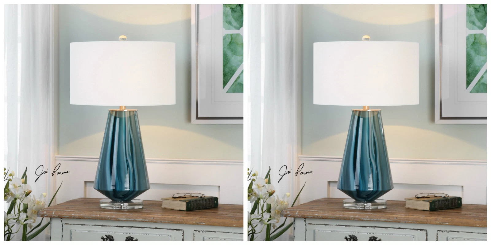 TWO PESCARA TEAL GRAY BLUE GLASS TABLE LAMPs CRYSTAL BASE 27225