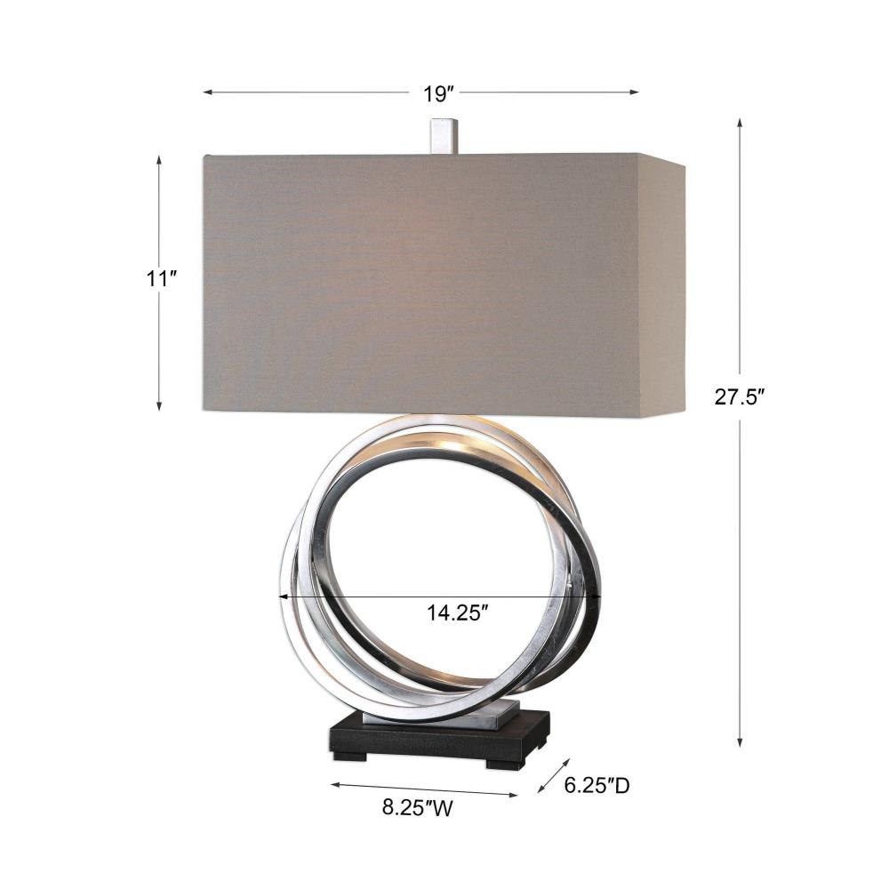 Sleek Iron Rings Finished In A Metallic Silver Leaf, Accented With A Rustic Bronze Foot. The Rectangle Hardback Shade Is A Light Beige Linen Fabric.