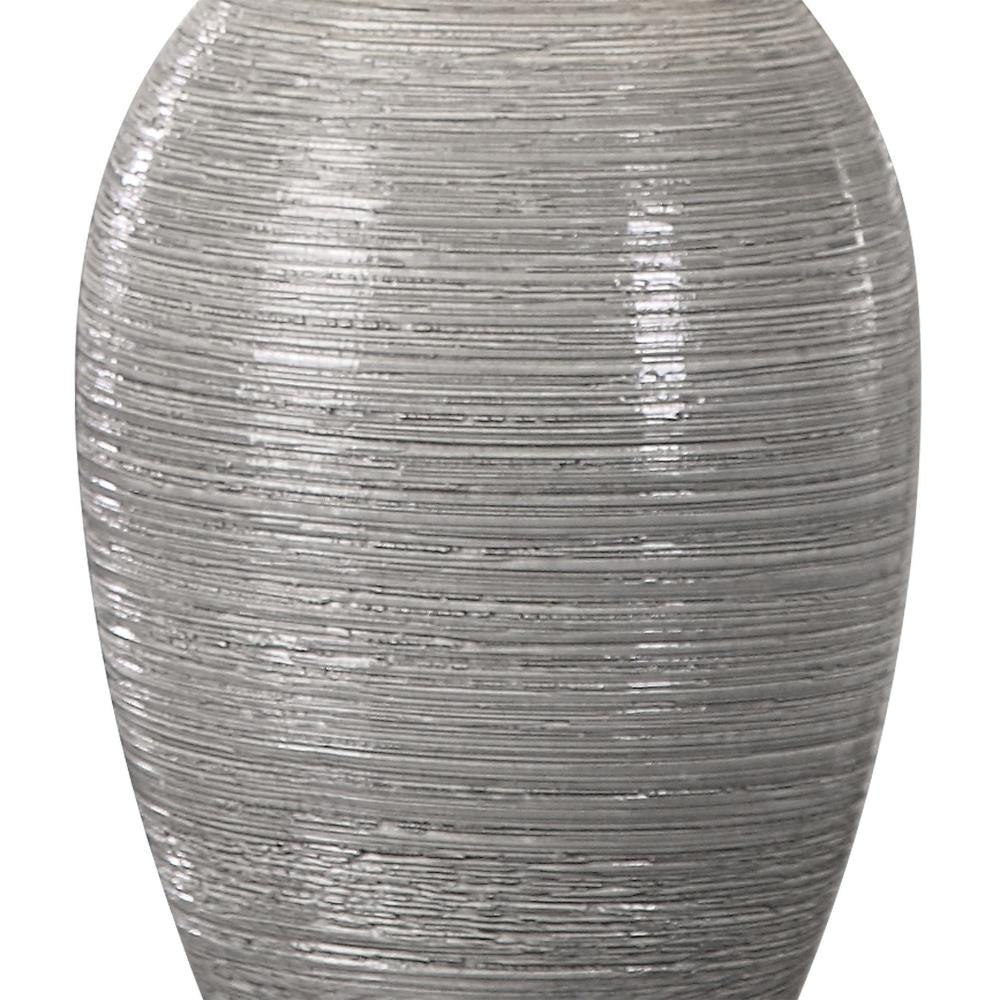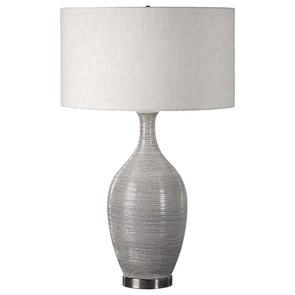 This Ceramic Base Features A Coarse, Horizontal Texture, Finished In A Mushroom Gray Glaze, Accented With Plated Polished Nickel Details. The Round Hardback Drum Shade Is A Light Beige Linen Fabric With Natural Slubbing. Due To The Nature Of Fired Glazes On Ceramic Lamps, Finishes Will Vary Slightly.