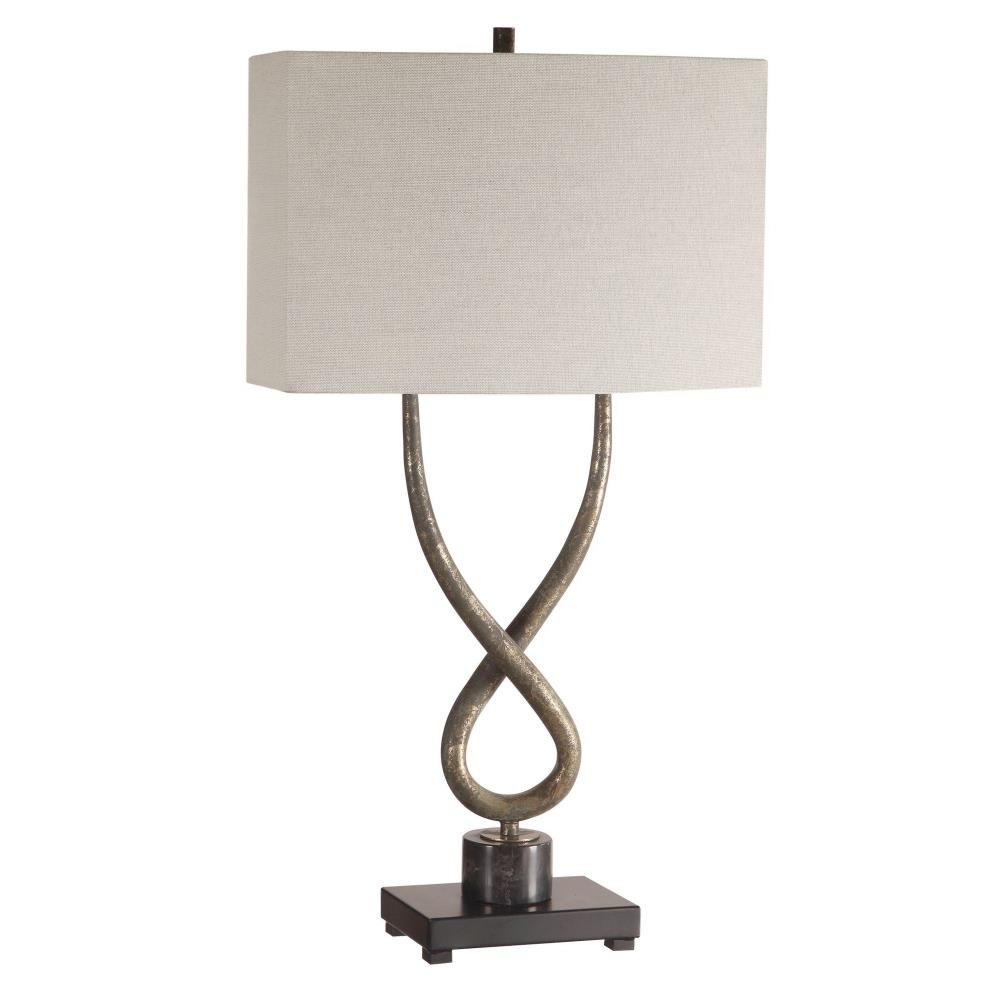 This Twisted Steel Base Is Gracefully Curved With A Subtly Tapering Design, Finished In A Heavily Distressed Aged Silver Leaf With Charcoal Undertones, Displayed On A Black Marble Column. The Oval Hardback Shade Is A Light Beige Linen Fabric With Straight Sides.
