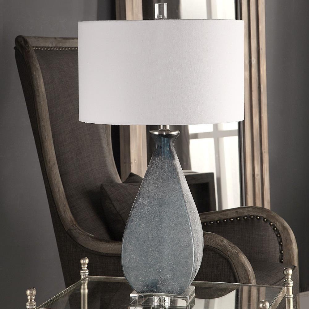 Deep Ocean Blue Glass With An Acid Etched Texture, Accented With Brushed Nickel Plated Details And A Thick Crystal Foot. The Round Hardback Drum Shade Is A White Linen Fabric.