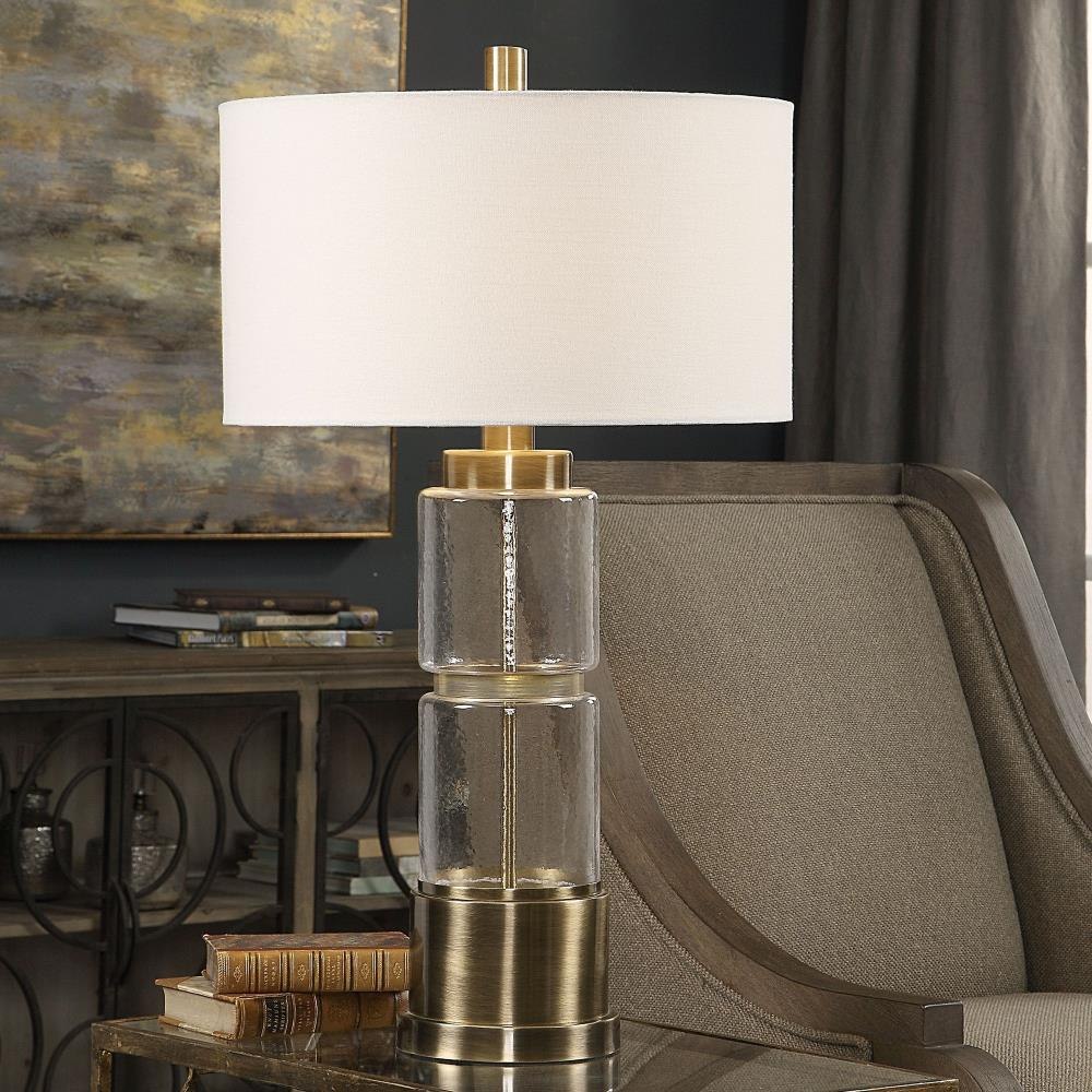 Stacked Clear Glass Columns With A Hammered Texture, Displayed With Antique Brass Plated Steel Details. The Round Hardback Drum Shade Is A White Linen Fabric With White Slubbing.