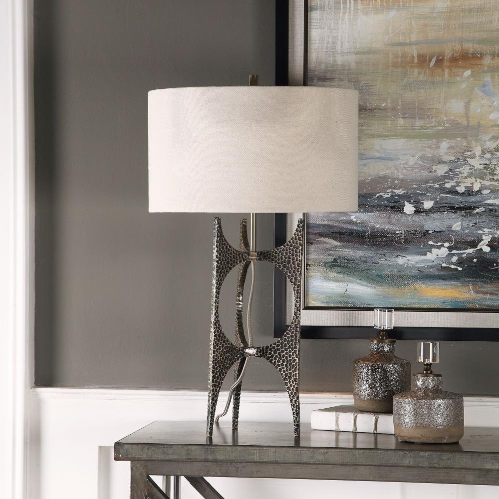 This Contemporary Design Is Formed From Cast Iron Featuring A Deep Hammered Texture, Finished In A Heavily Antique Golden Bronze, Paired With An Exposed Fabric Covered Cord. The Round Hardback Drum Shade Is White Linen Fabric.