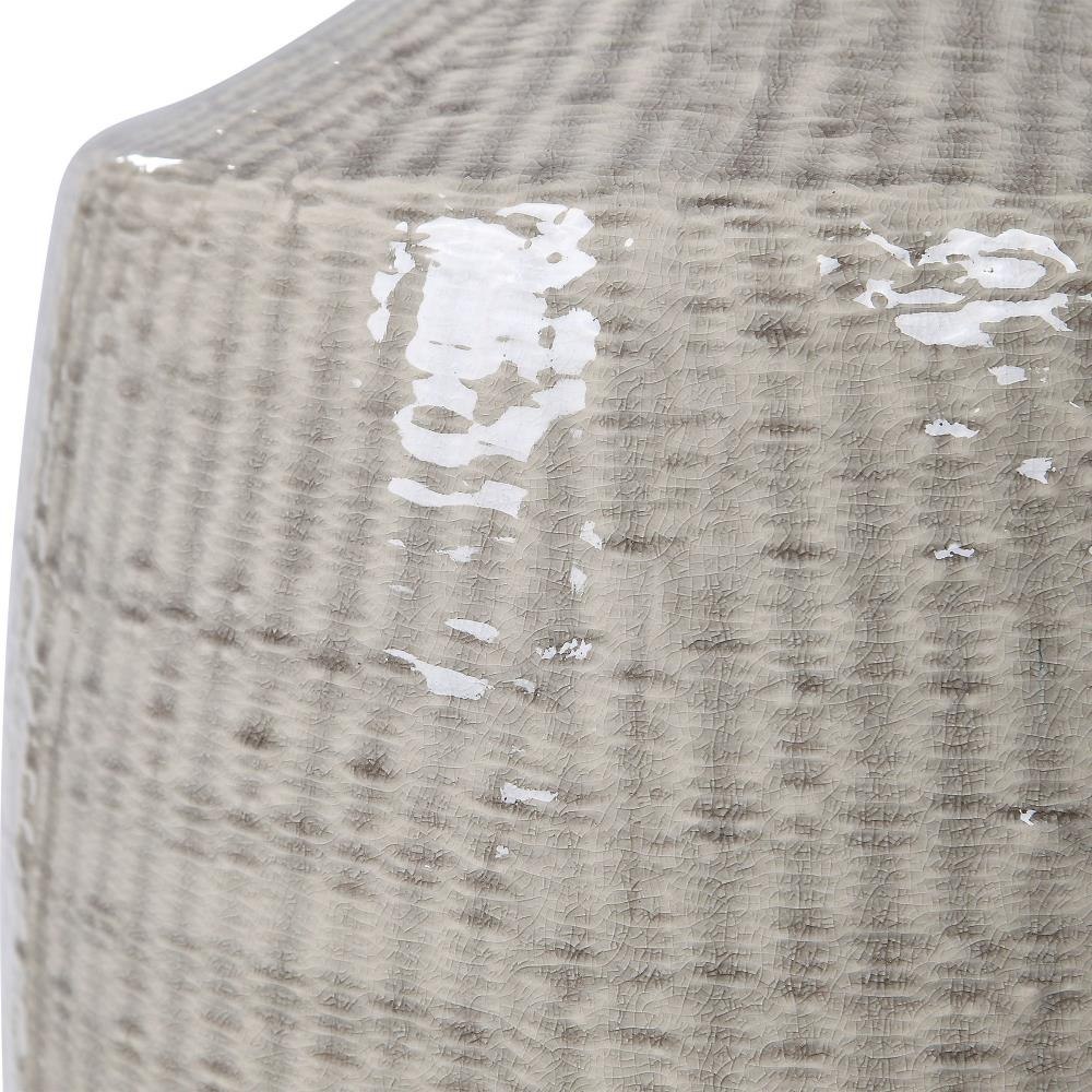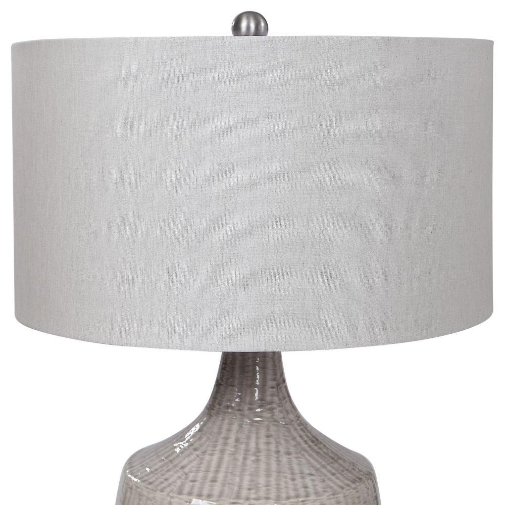 This Ceramic Base Keeps It Simple In Shape, Yet Upscale With Its Fashionable Pattern That's Finished In A Distressed Light Gray Glaze, Paired With Brushed Nickel Plated Accents. The Hardback Drum Shade Is Light Gray Linen Fabric.
