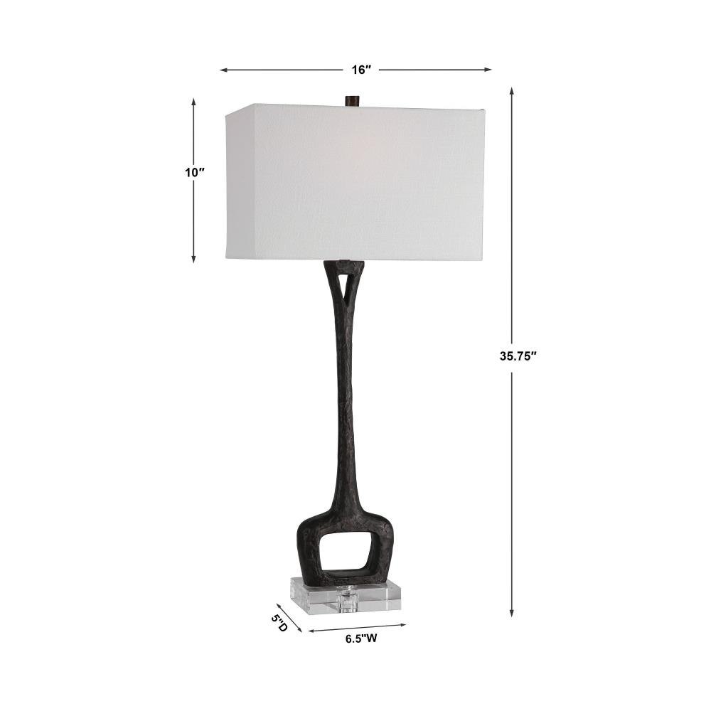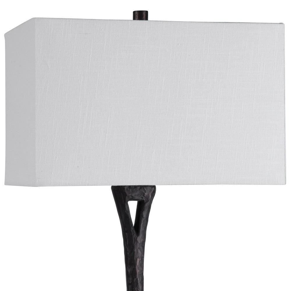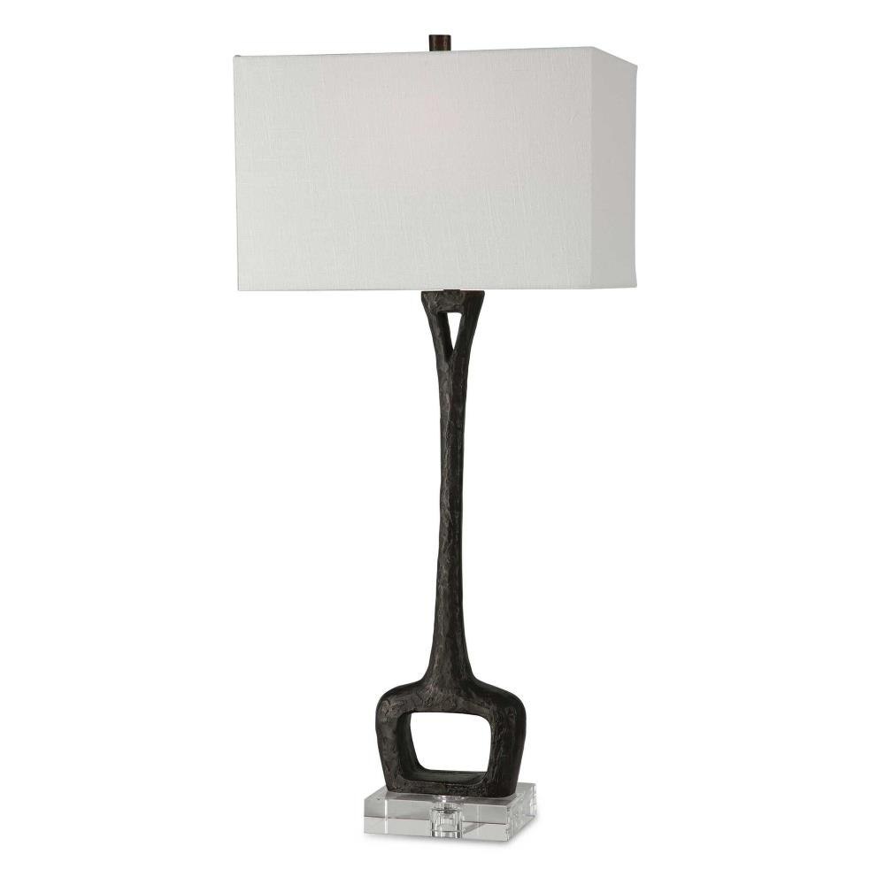This Cast Iron Table Lamp Is Finished In A Masculine Aged Black With A Heavy Organic Texture Displayed On An Elegant Crystal Foot. The Lamp Is Paired With A Rectangular Hardback Shade In A White Linen Fabric With Vertical Slubbing.