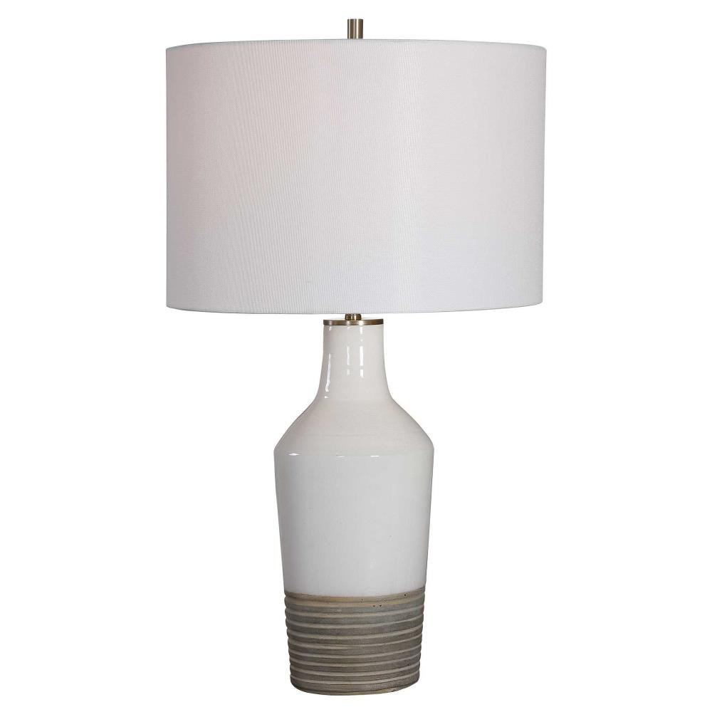 This Ceramic Lamp Features A White Crackle Glaze Finish Paired With A Ribbed Textured Bottom Half Finished In An Aged Terra Cotta Tone, Accented By Light Antique Brushed Brass Details. A Simple White Linen Fabric Drum Shade Compliments The Piece.