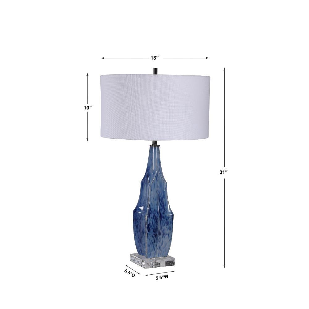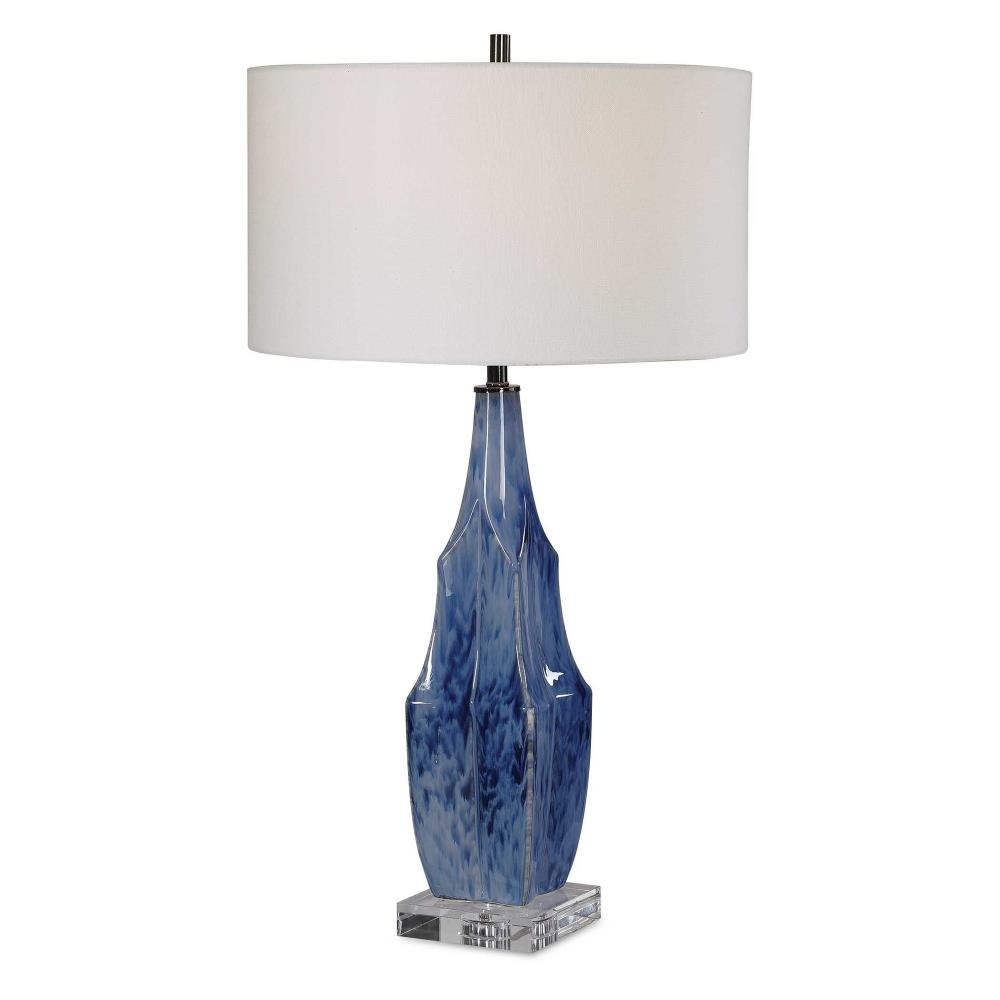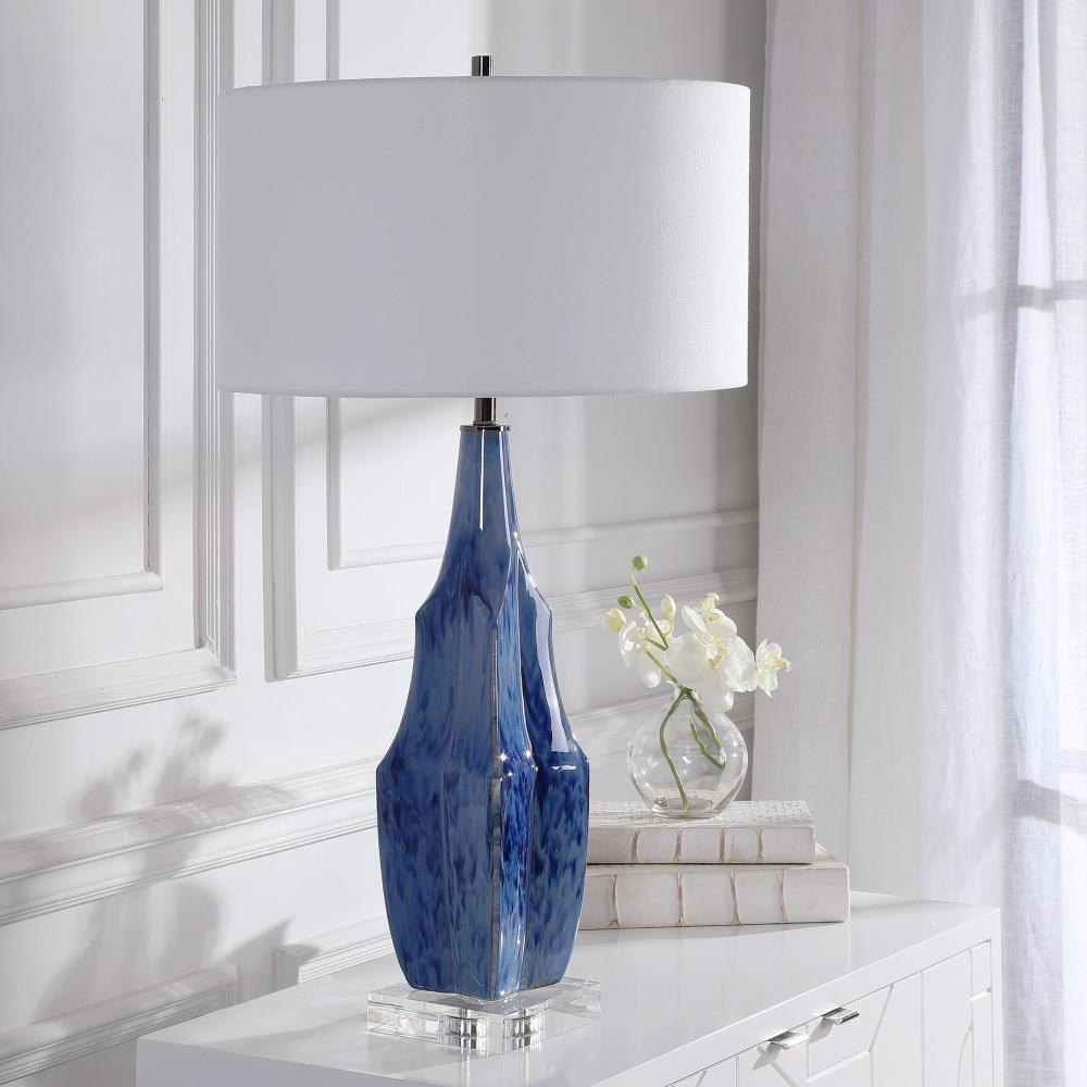 This Ceramic Table Lamp Is Finished In A Beautiful Reactive Indigo Blue Glaze, Accented By Elegant Polished Nickel And Crystal Details. A White Linen Fabric Drum Shade Completes The Look.