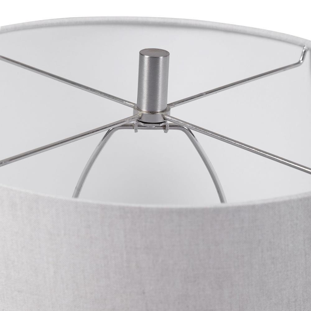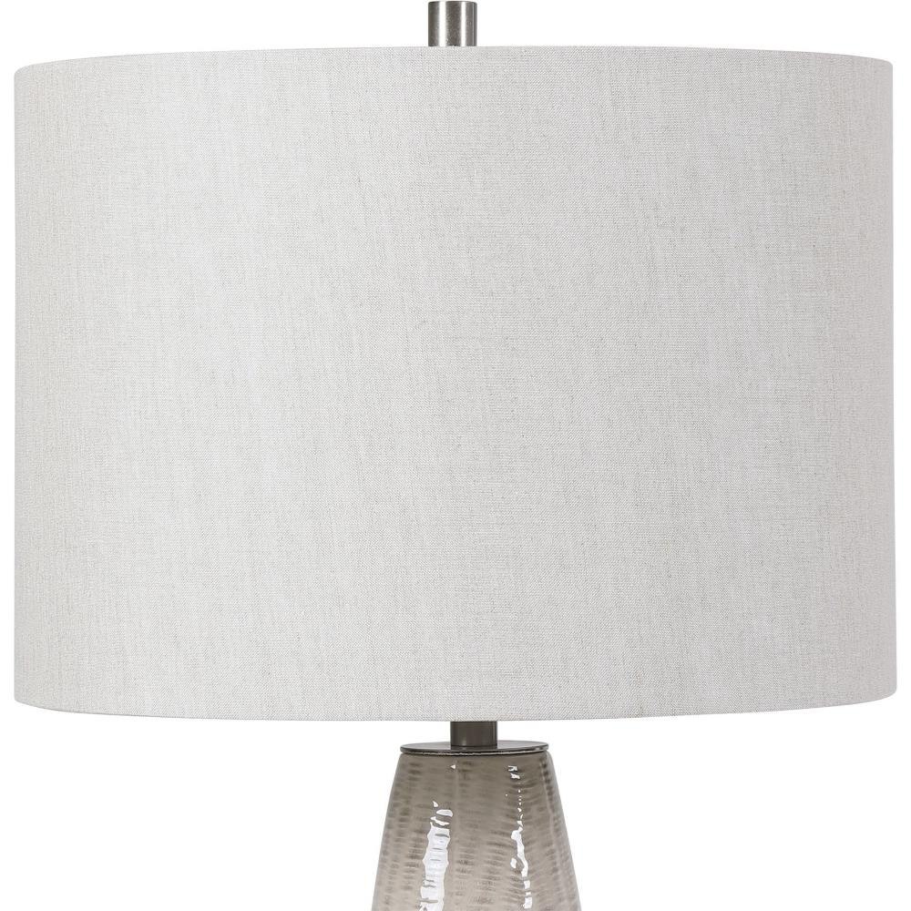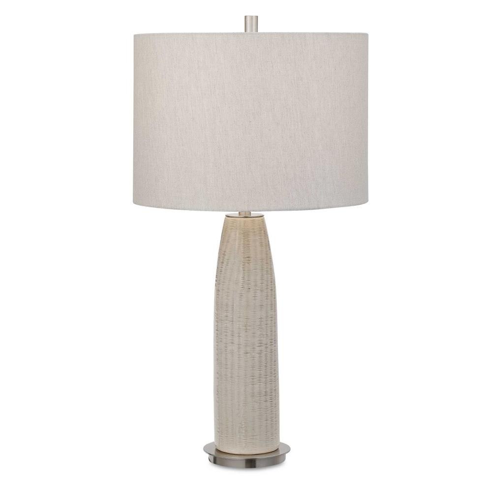 This Ceramic Base Keeps It Simple Yet Upscale With A Fashionable Pattern Finished In A Distressed Light Gray Glaze, Paired With Brushed Nickel Plated Accents. The Hardback Drum Shade Is Light Gray Linen Fabric.