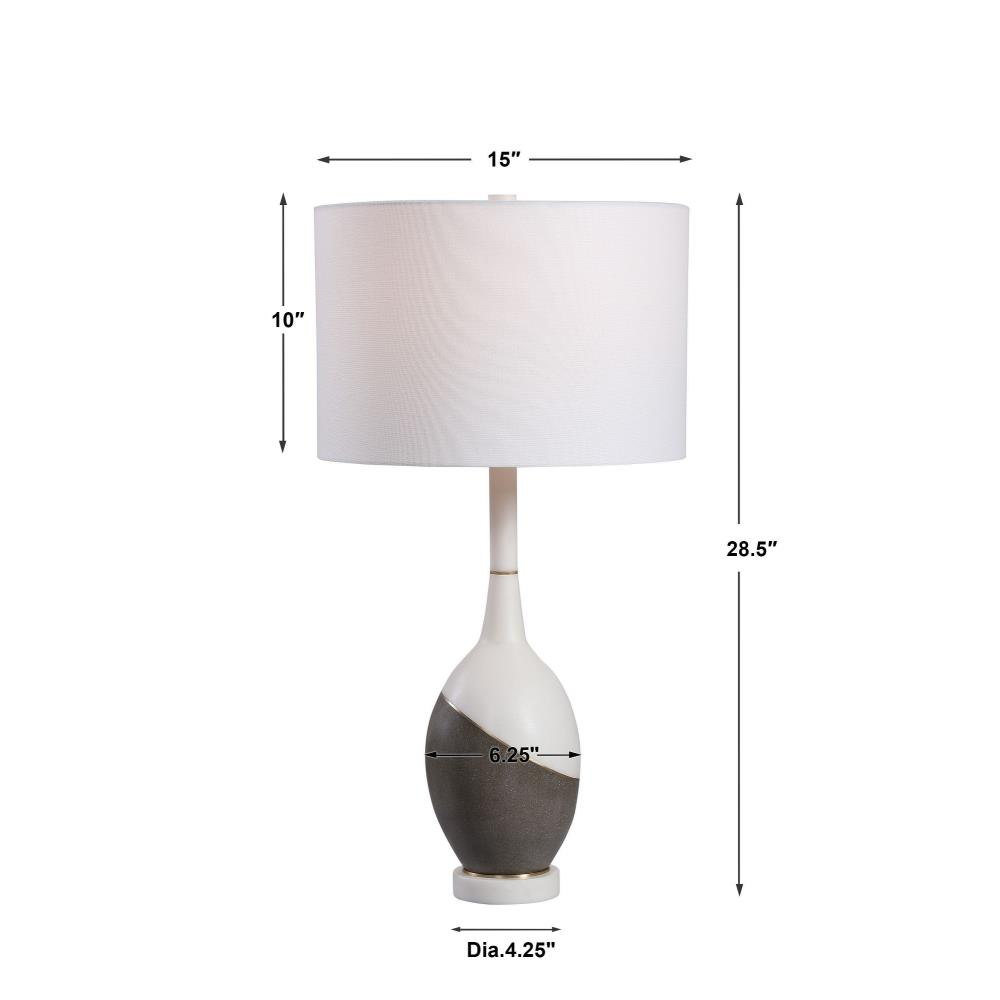 Simple Yet Sophisticated, This Table Lamp Features A Combination Of Honed Charcoal Concrete And A Polished White Marble Look, Accented By Brushed Gold Plated Accents. The Lamp Is Complimented By A Crisp White Hardback Drum Shade.