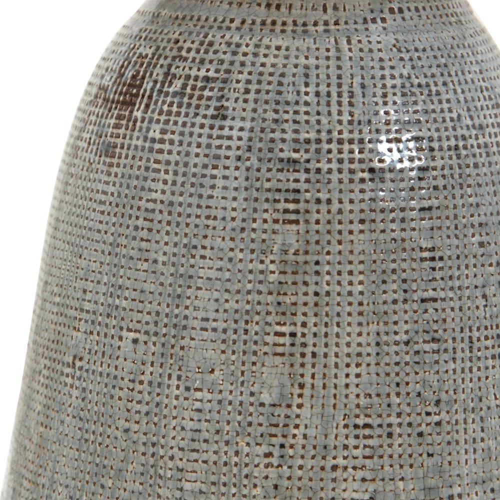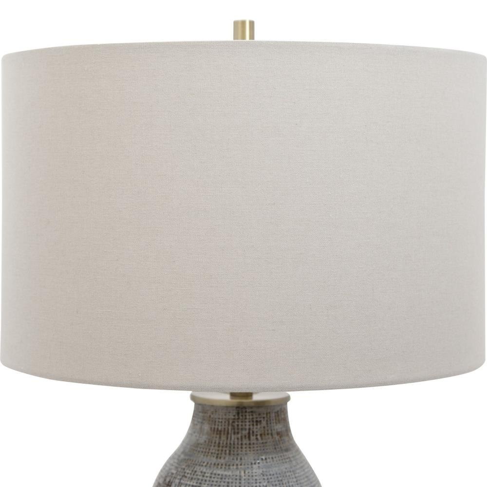 Exhibiting A Handcrafted Look, This Ceramic Table Lamp Features A Textured Finish Reminiscent Of Woven Fabric And Is Finished In Various Shades Of Neutral Grays And Taupe With Rust Brown Accents And Antique Brushed Brass Hardware. The Piece Is Completed By An Off-white Hardback Drum Shade With Natural Slubbing.