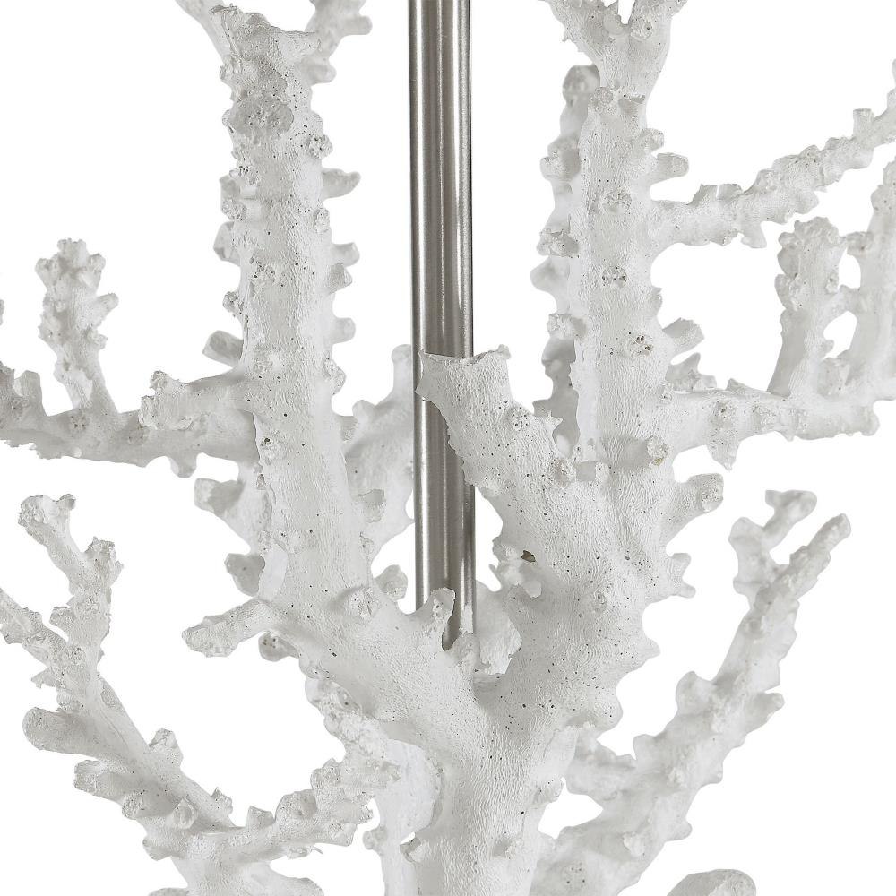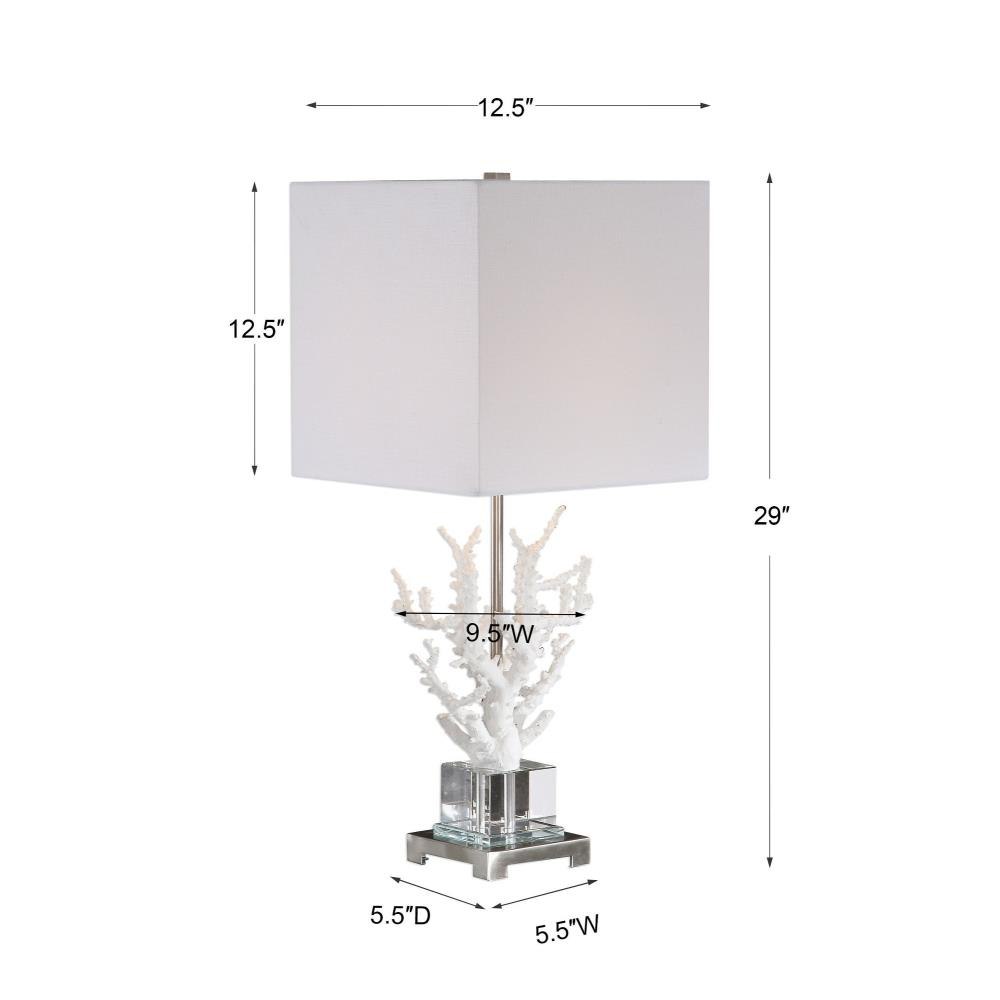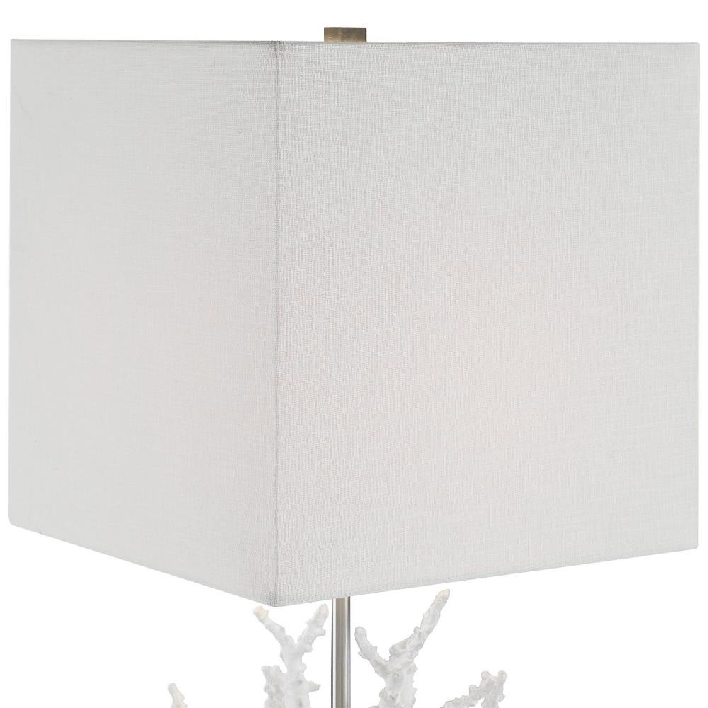 Add Nautical Style To Any Space With This Realistic White Coral Lamp That Is Displayed On An Elegant Crystal Platform, Accented With Polished Nickel Plated Details. The Square Hardback Shade Is A Light Beige Linen Fabric With Natural Slubbing.