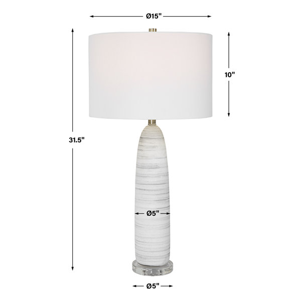 This sleek ceramic table lamp features a matte white glaze with brushed light gray detailing, paired with brushed nickel-plated accents and a crystal foot. A white fabric drum shade complements the piece.