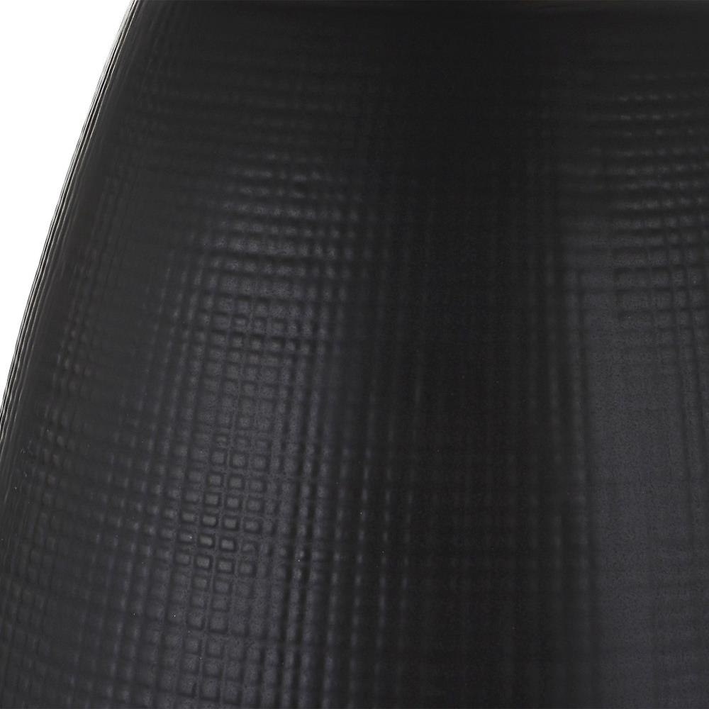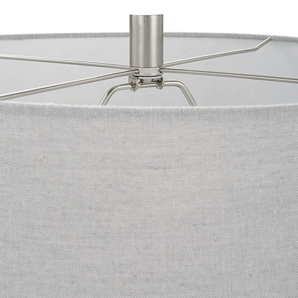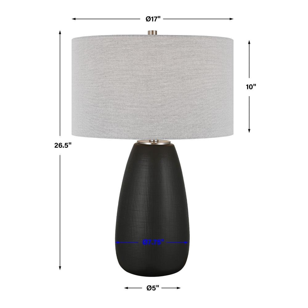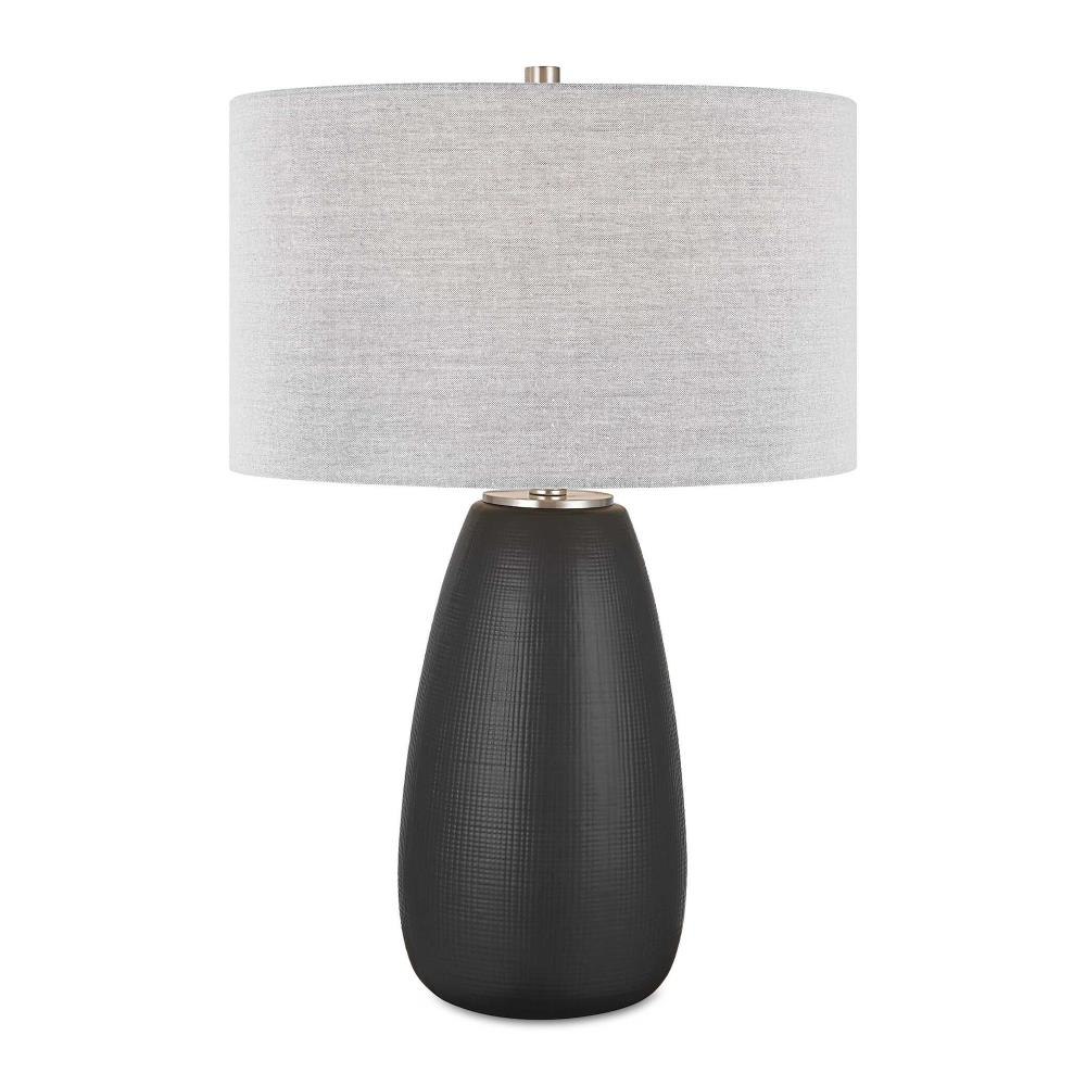 The Twilight Table Lamp Features A Ceramic Base With A Subtle Carved Gridline Texture, Finished In A Satin Black Glaze And Accented By Brushed Nickel Plated Details. The Hardback Drum Shade Is Covered In A Light Gray Linen Fabric.