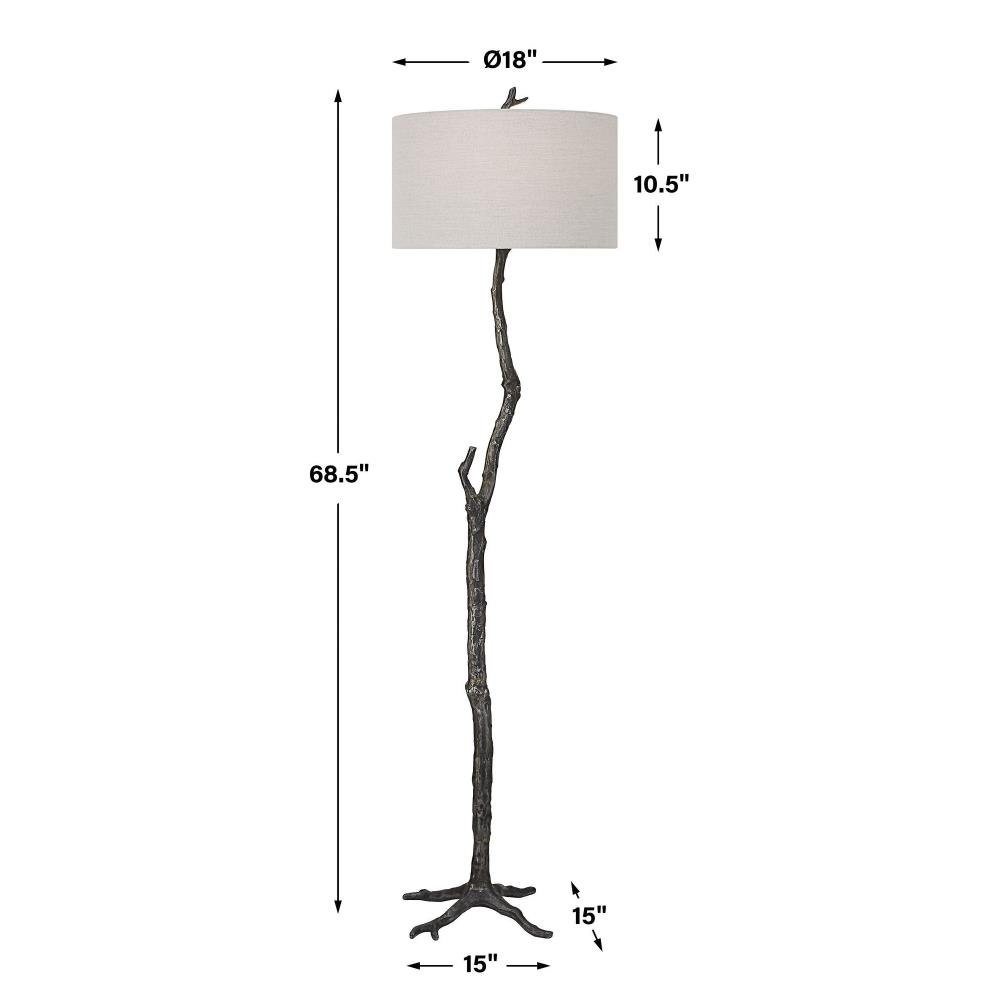 Drawing Inspiration From Nature, This Floor Lamp Is Handcrafted From Cast Iron With Sculpted Details Finished In Distressed Rustic Black And Subtle Silver Undertones. A Hardback Drum Shade In Light Gray Linen Fabric Accents The Piece.