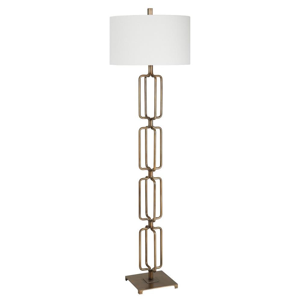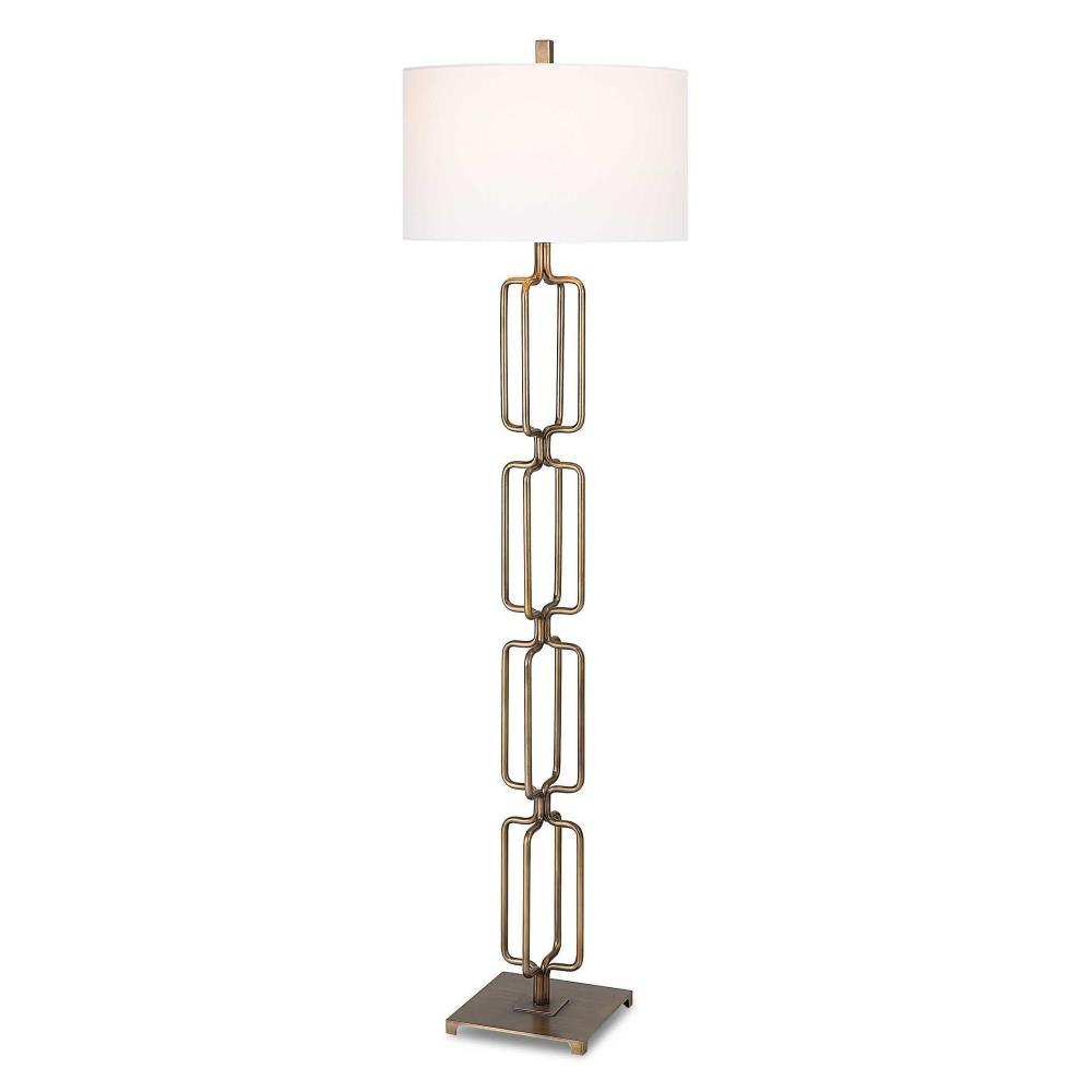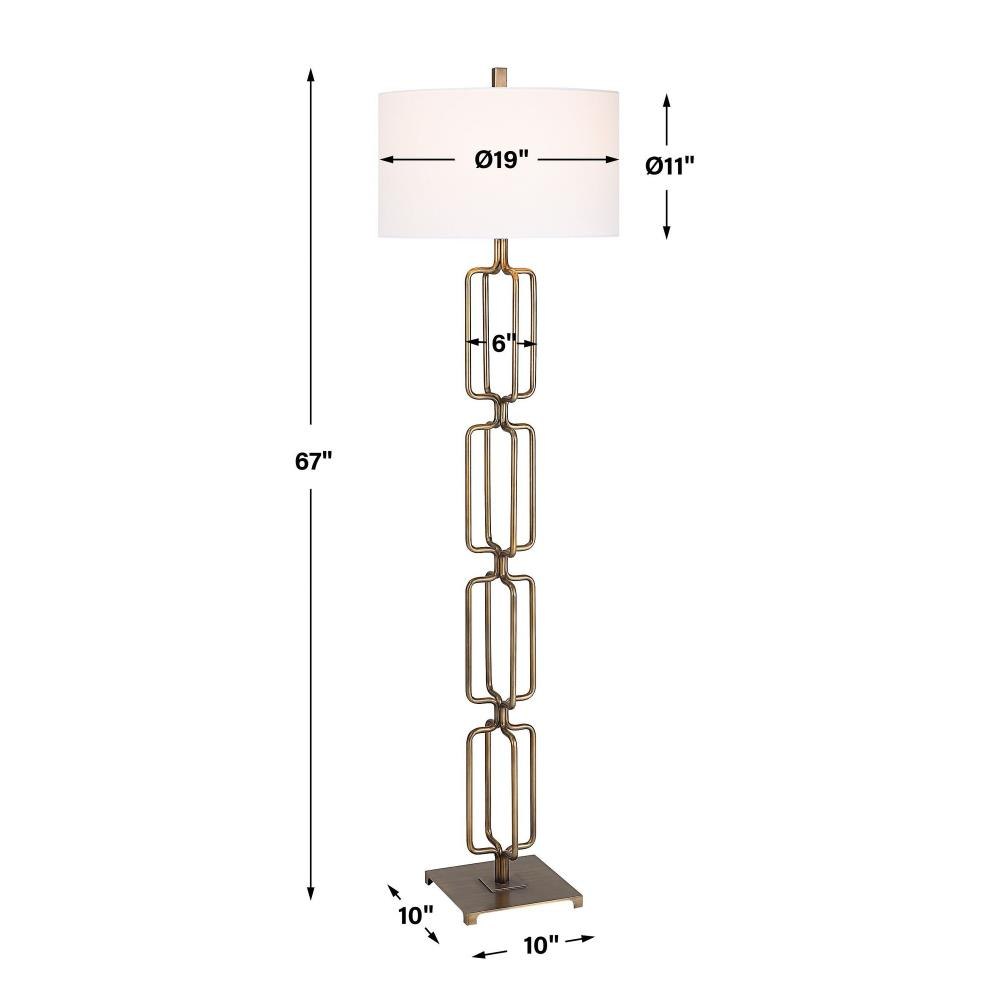 The Link Floor Lamp Features A Unique Design Made From Hand Forged Iron, Finished In A Heavily Antique Brushed Gold. The Hardback Drum Shade Is Covered In A White Linen Fabric.