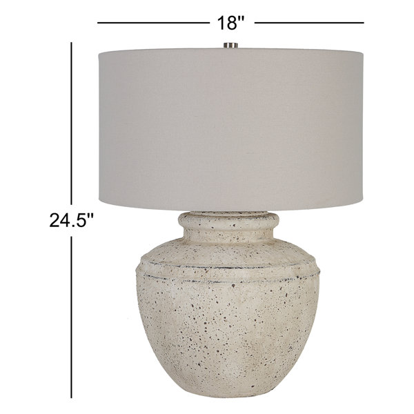 Inspired by antique pottery, this ceramic table lamp features an aged stone finish with character distressing and dark undertones, accented with plated brushed nickel details. The drum shade is covered in a light gray linen fabric.
