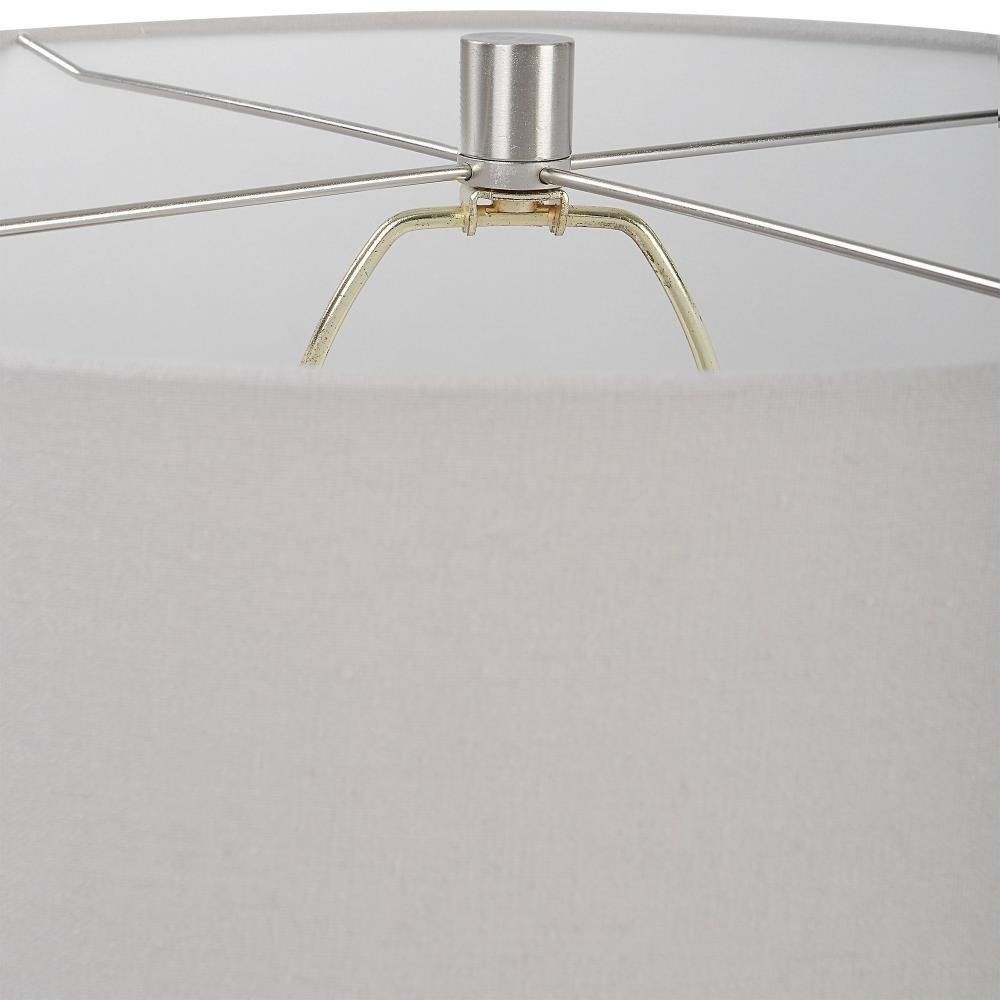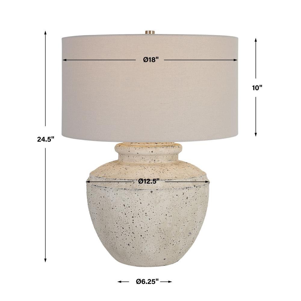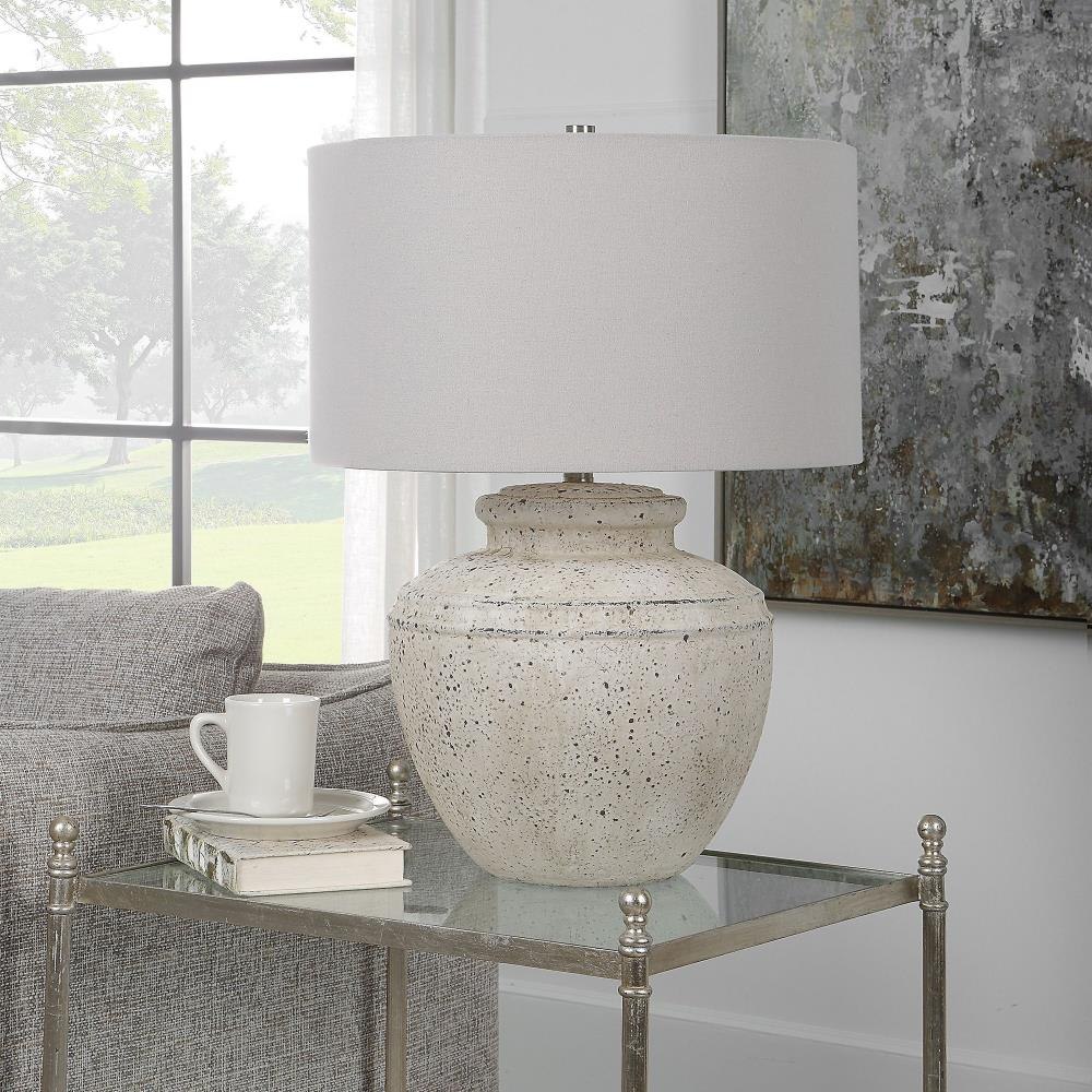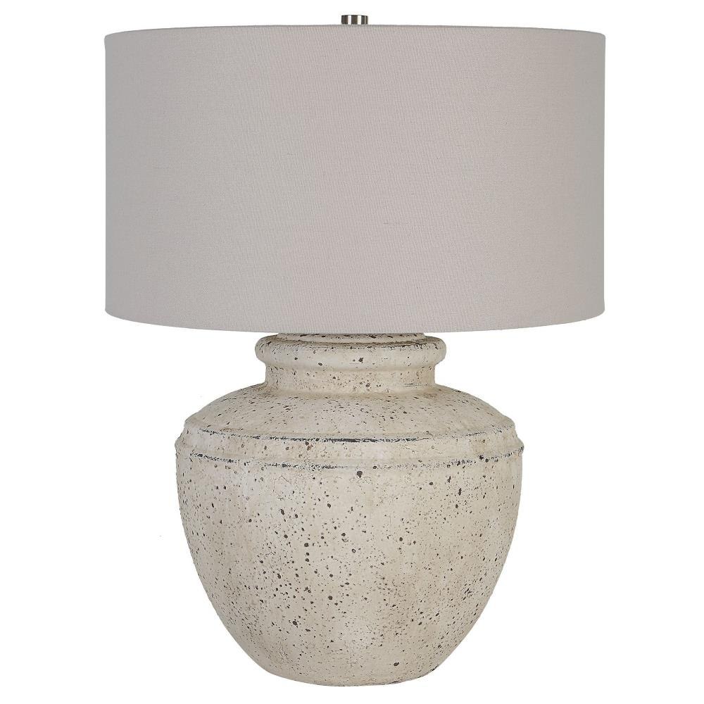 Inspired By Antique Pottery, This Ceramic Table Lamp Features An Aged Stone Finish With Character Distressing And Dark Undertones, Accented With Plated Brushed Nickel Details. The Drum Shade Is Covered In A Light Gray Linen Fabric.