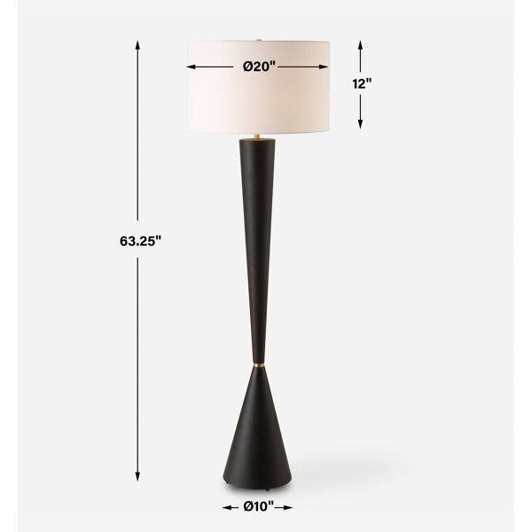 This floor lamp features a tapered iron base finished in a lightly textured black, complemented by antique brass plated details for a touch of vintage allure.
