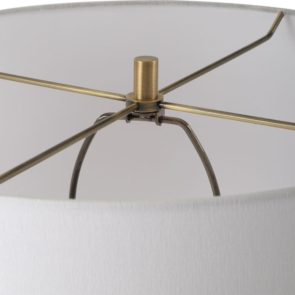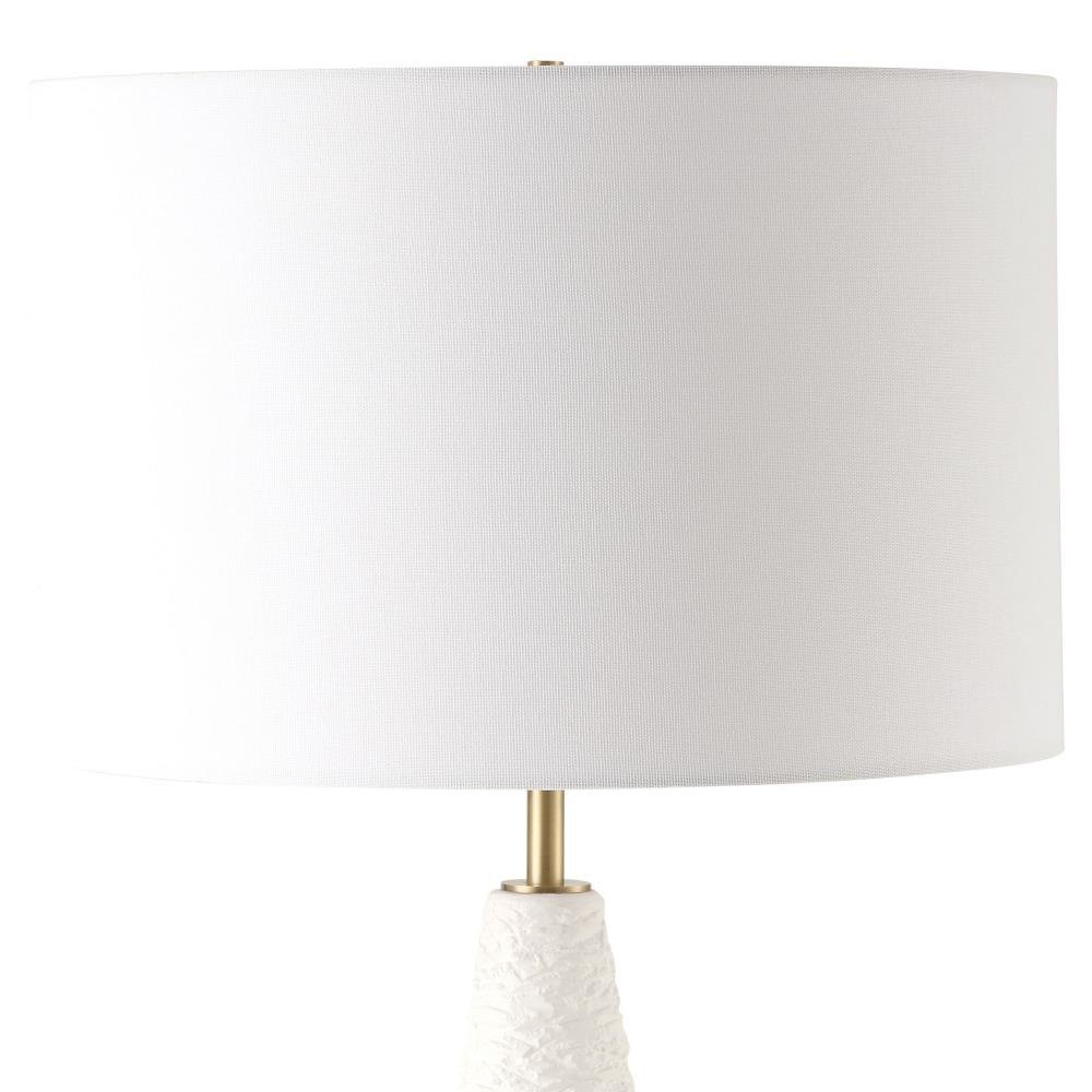 This Floor Lamp Features Heavily Textured White Ceramic That Exudes A Sense Of Artistic Allure, While Plated Antique Brass Details Add A Touch Of Timeless Sophistication. The Round Hardback Drum Shade Is A Crisp White Linen Fabric.