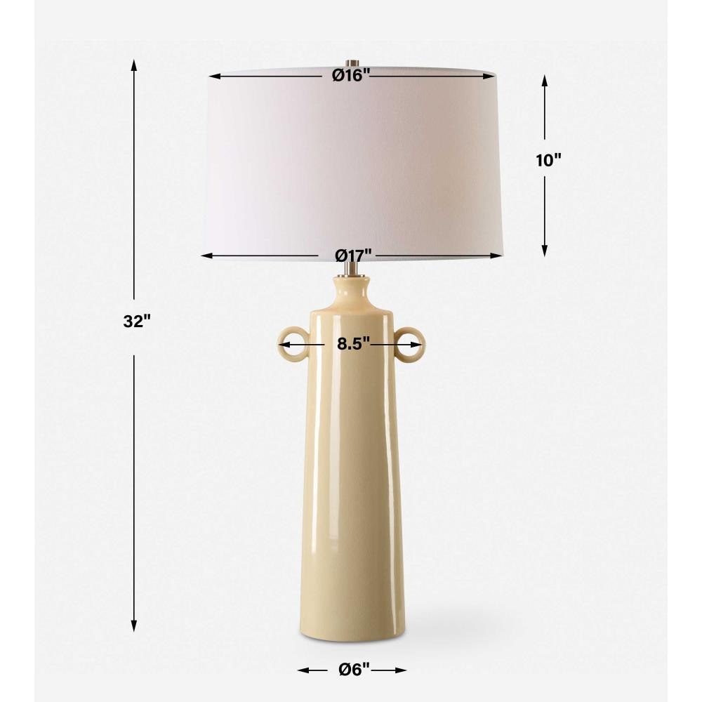 This Ceramic Lamp Boasts A Vase-like Shaped Base In A Pale Yellow Crackled Glaze, Accented With Plated Brushed Nickel Details. A Slightly Tapered Round Drum Shade In A White Linen Fabric Completes The Piece.