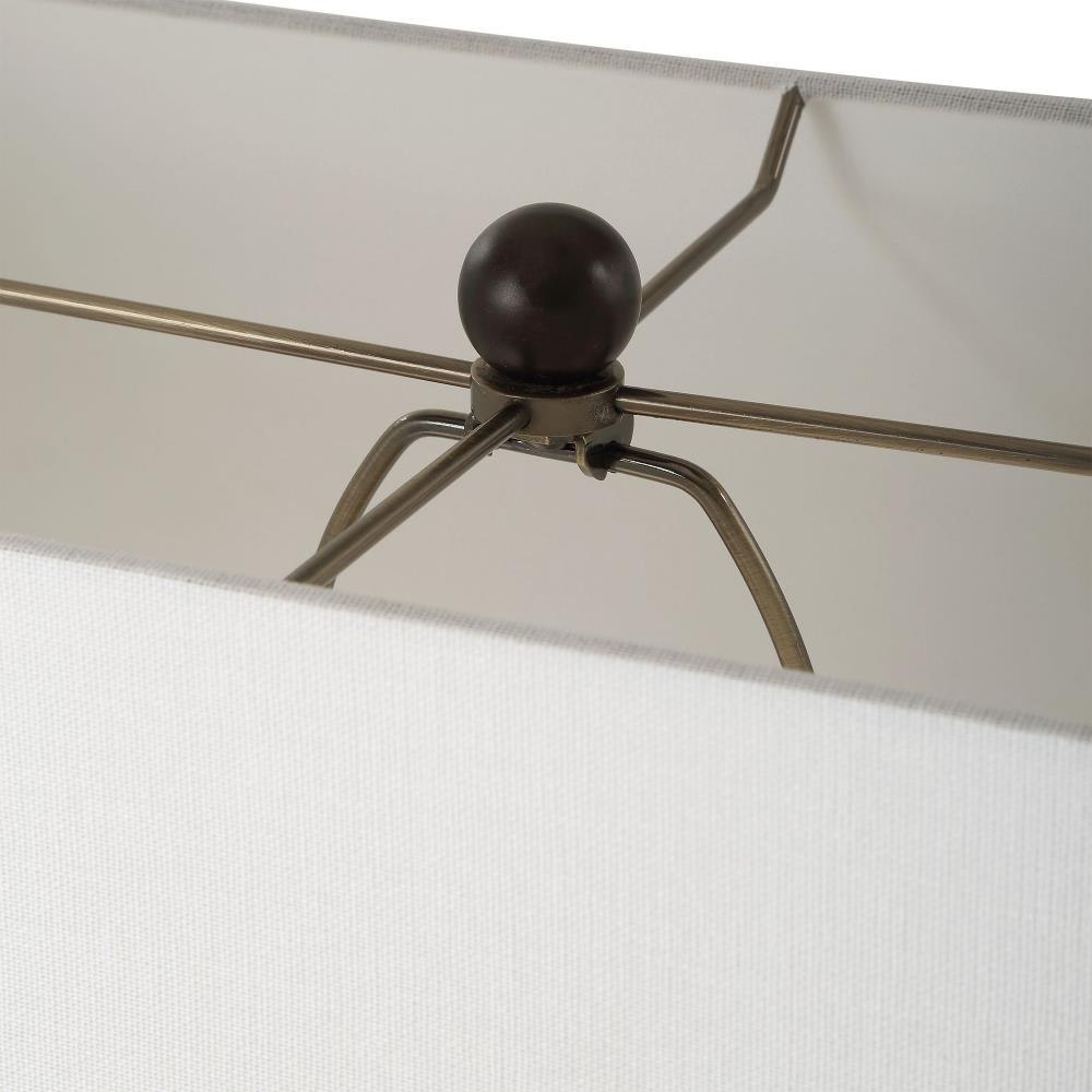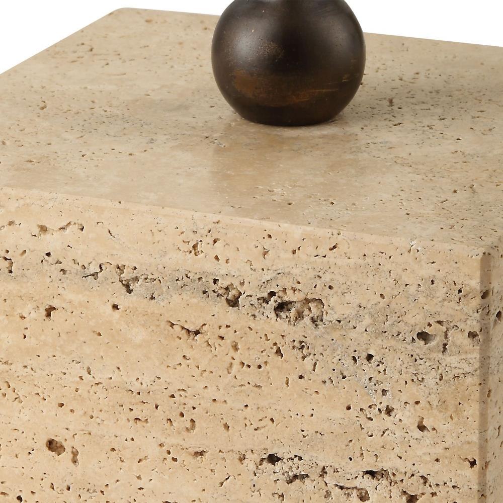 This Floor Lamp Features A Unique Split Iron Column Finished In A Warm Dark Bronze, Displayed On A Substantial Block Of Beige Travertine. The Rectangle Drum Shade Is Covered In A Causal White Linen Fabric.