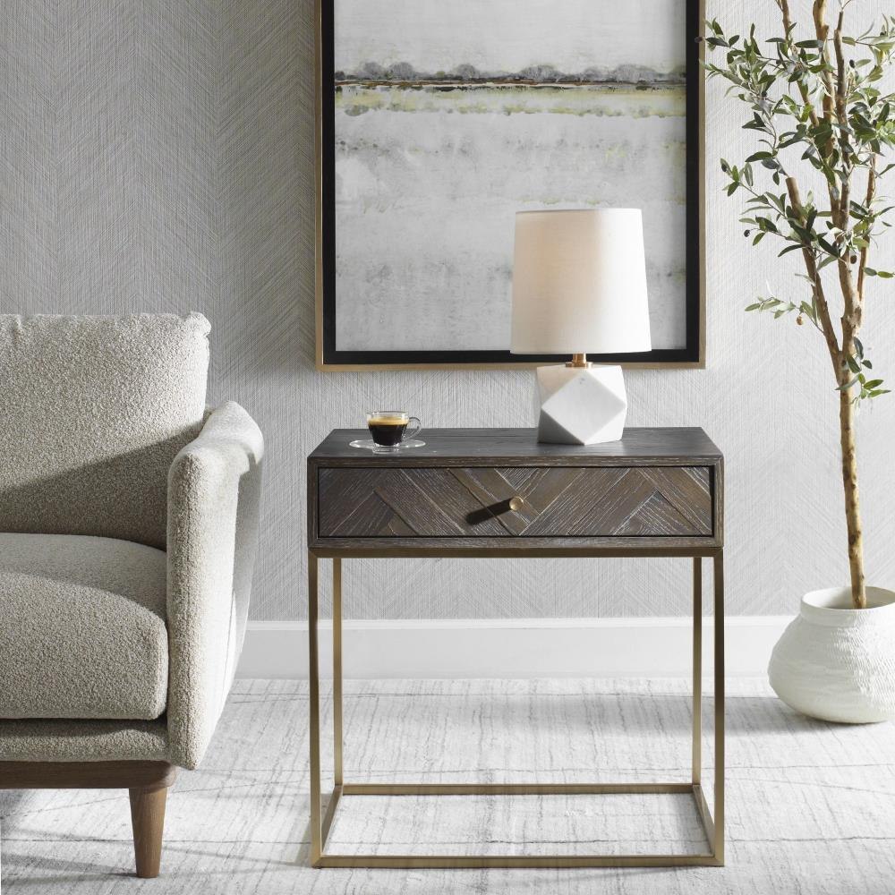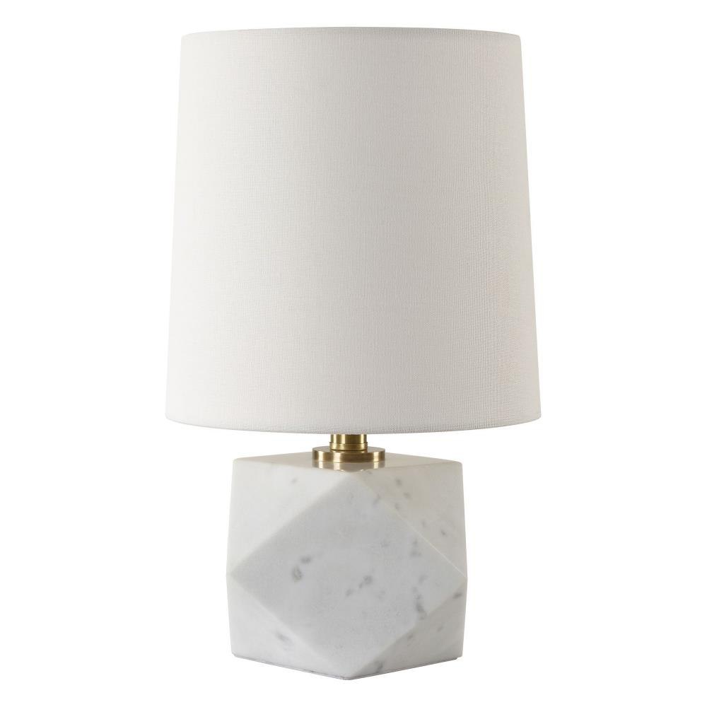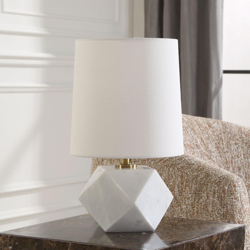 Featuring A Faceted Design, A Cut Above Table Lamp Is Crafted From White Marble With Subtle Veining And Accented With Plated Antique Brass Hardware. The Slightly Tapered Round Hardback Shade Is Covered In White Linen Fabric With Light Slubbing.