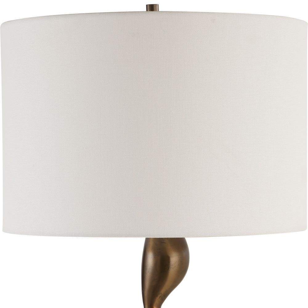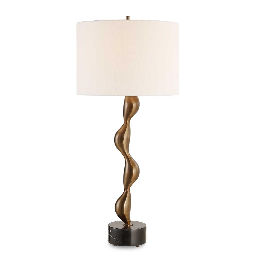 This Stunning Lamp Demands Attention With Its Playful And Unique Profile. The Design Is Crafted From Cast Iron, Finished In A Plated Warm Bronze And Displayed On A Thick Black Marble Foot, Giving This Table Lamp A Rich Elegance. A Round Hardback Drum Shade Made With A Crisp White Linen Fabric Completes The Piece.