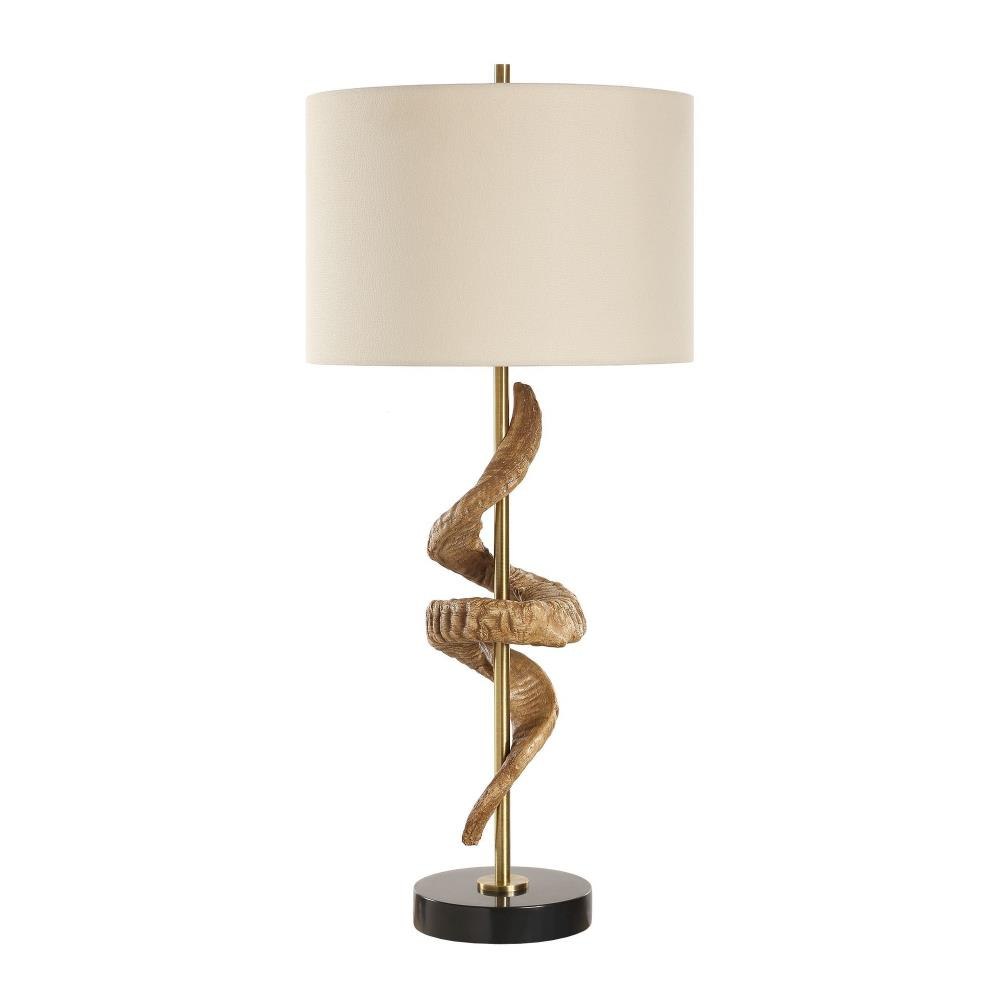 This Eye-catching Table Lamp Showcases A Sculpture Inspired By A Rams Horn Displayed Around A Plated Antique Brass Column And A Thick Black Marble Foot. A Round Hardback Drum Shade Made With An Off-white Linen Fabric Completes The Piece.