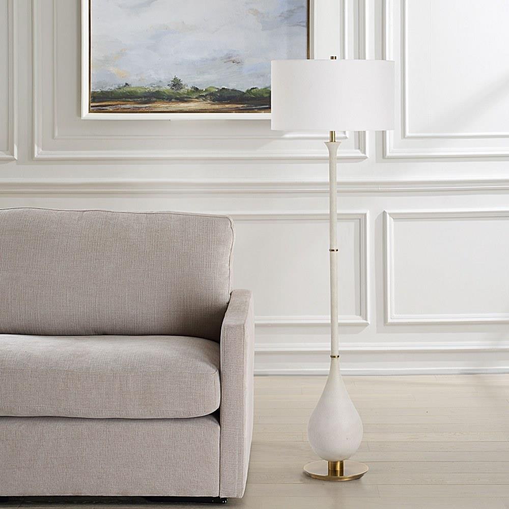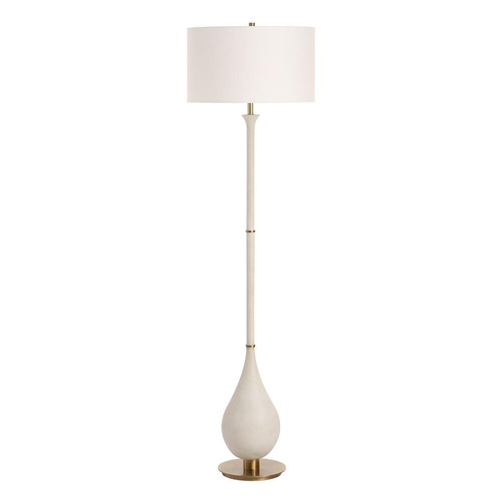 Featuring A Teardrop-shaped Base Made Of Ivory Man-made Stone That Accurately Replicates The Look Of Thassos Marble, Accented With Plated Brushed Antique Brass Details, The Dewdrop Floor Lamp Is A Refined Addition To Any Space. The Round Hardback Shade Is A Crisp White Linen Fabric.