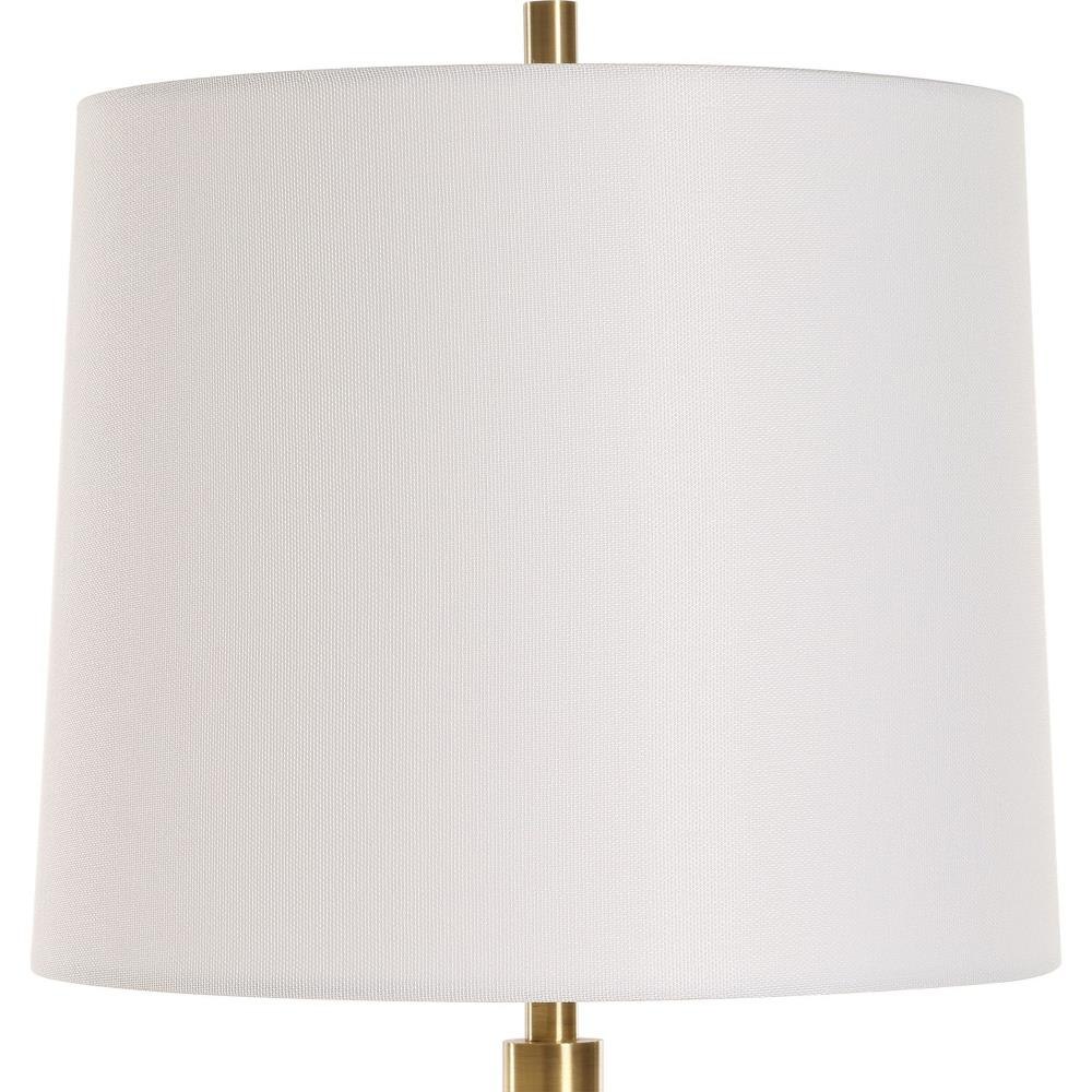 The Bledel Buffet Lamp Features A Sleek And Sophisticated Plated Brushed Brass Column Elevated By A Polished Dark Green Marble Orb. The Slightly Tapered Round Hardback Shade Is Covered In A Timeless White Linen Fabric.
