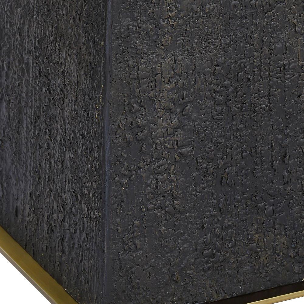 The Lathey Floor Lamp Showcases A Tapered Base With A Burned Wood Look Replicating The Timeless Shou Sugi Ban Technique Of Preserving Wood, Accented With Plated Brass Details. The Round Hardback Drum Shade Is A Casual White Linen Fabric.