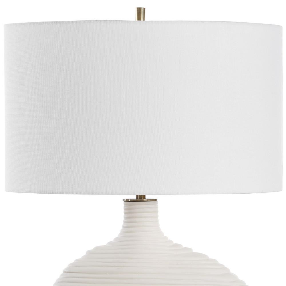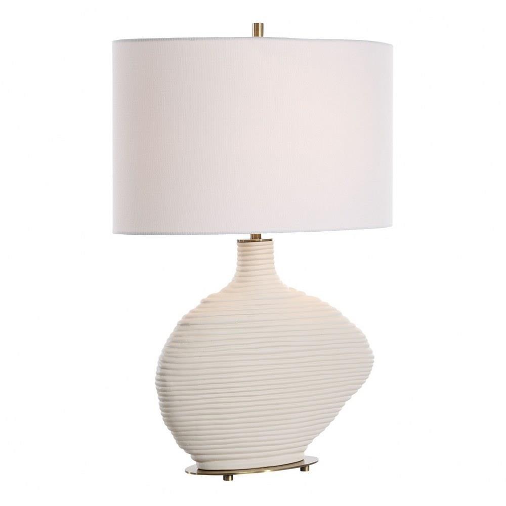 The Duostacked Table Lamp Is Crafted With Care From High-quality Ceramic With A Warm White Finish, Paired With Antique Brass Plated Details. The Organically Shaped Silhouette And Stacked Ring Design Creates A Visual Appeal. The Oval Hardback Shade Is An Off-white Linen Fabric With Natural Slubbing.