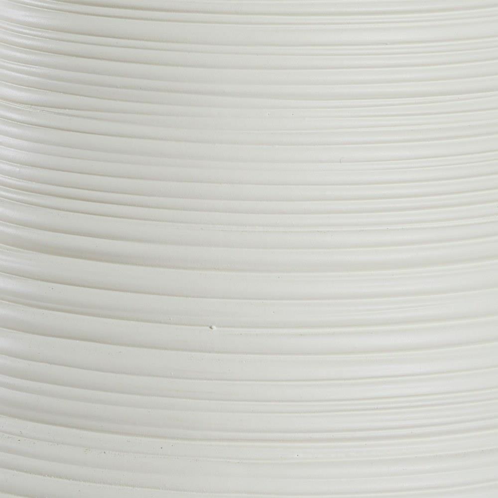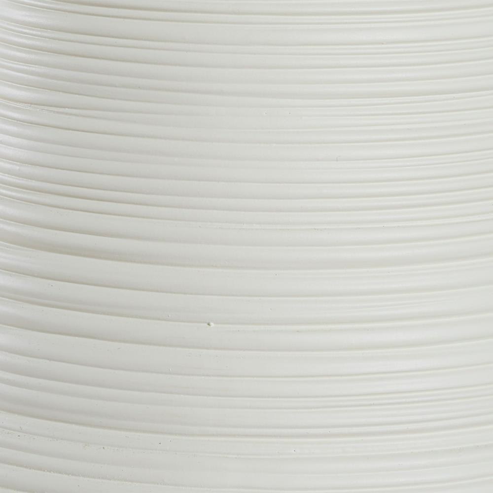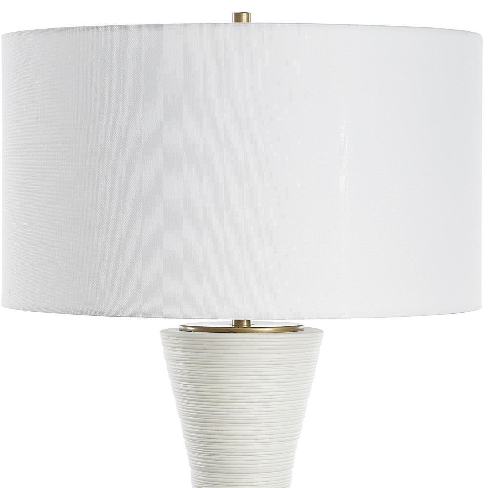 This Ceramic Table Lamp Boast A Warm White Matte Finish With Horizontal Ridge Lines, Adding A Touch Of Texture And Visual Interest To Sleek Curves, Paired With Plated Antique Brass Details. A Round Hardback Drum Shade Finished In A Casual White Linen Fabric Completes The Piece.