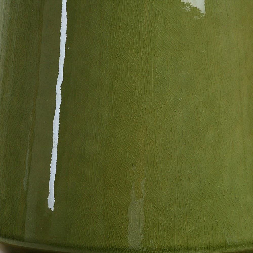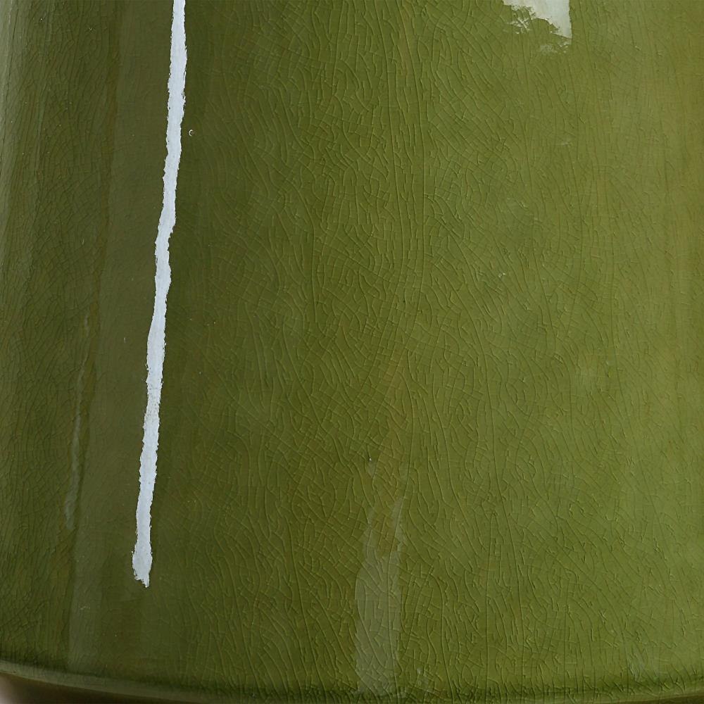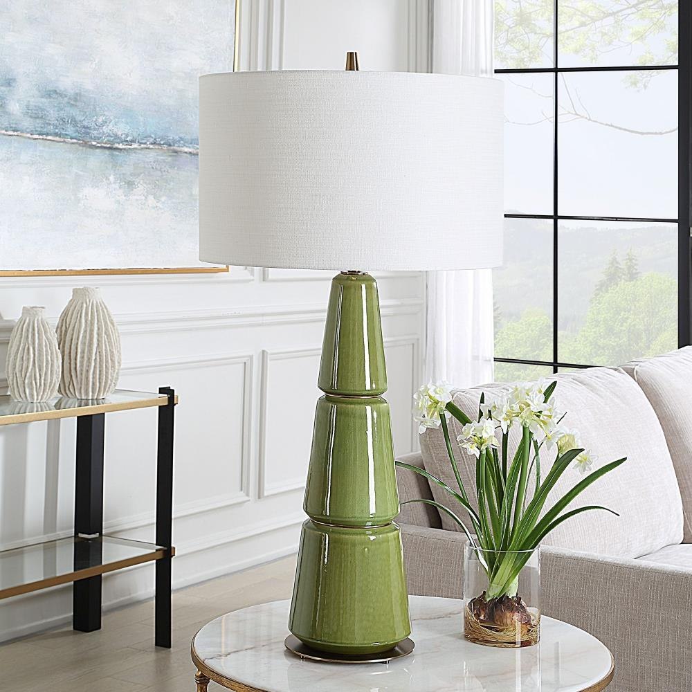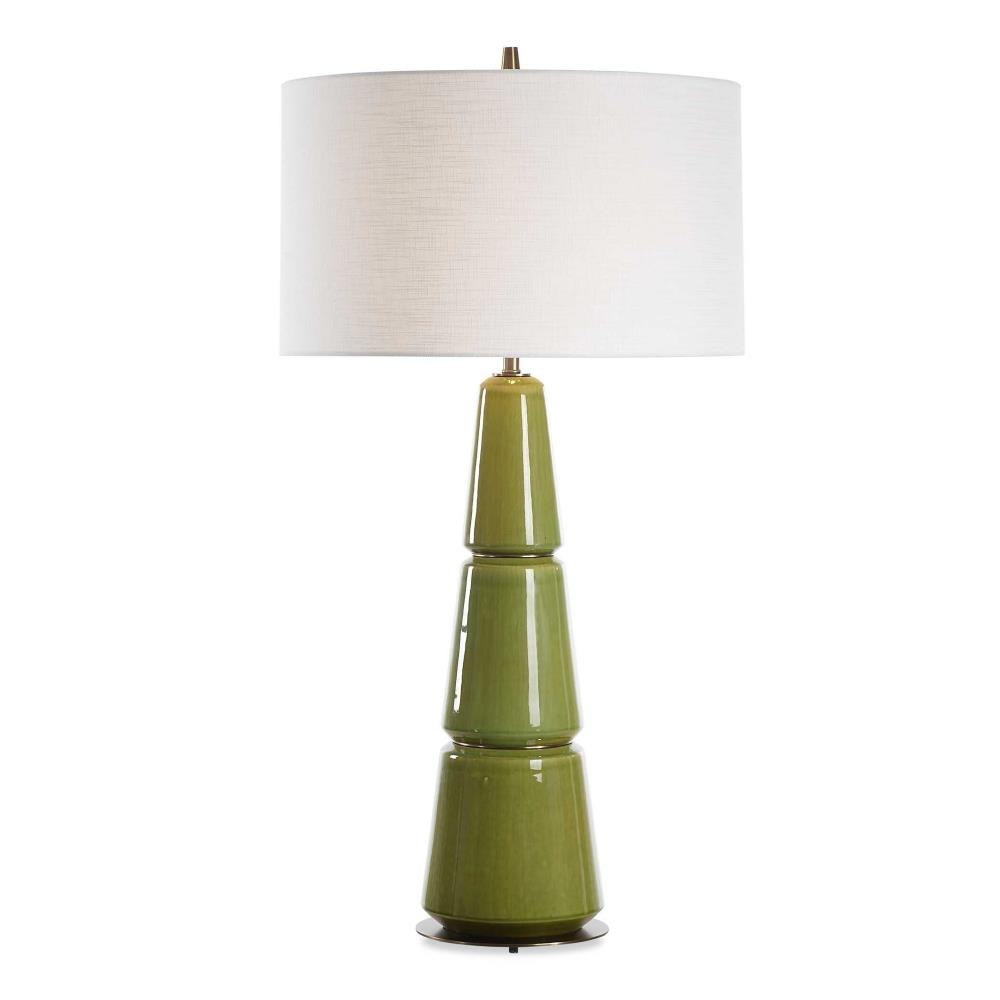 The Mendell Table Lamp Features A Tapered Ceramic Silhouette With A Matching Finial Finished In A Crackled Moss Green Glaze Complemented By Plated Antique Brass Details. A Round Hardback Drum Shade Covered In A White Linen Fabric With Natural Slubbing Completes The Piece.