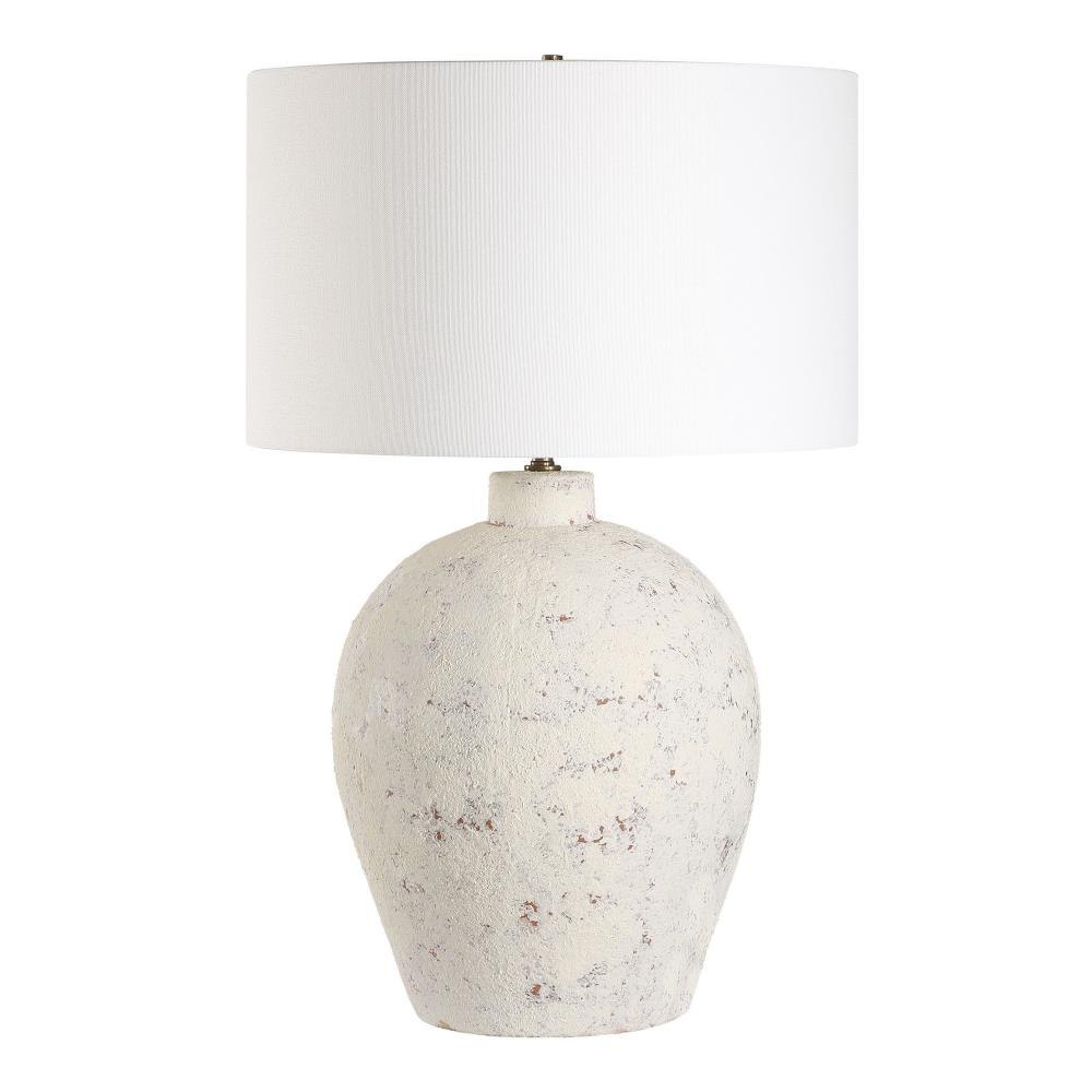 The Karena Table Lamp Boasts A Timeless Porcelain Urn Shaped Base Finished In A Heavily Distressed Stone Ivory With Dark Gray Undertones. Accentuated By Brushed Brass Plated Details, This Lamp Exudes Organic Warmth And Rustic Sophistication. The Round Hardback Drum Shade Is An Off-white Linen Fabric.