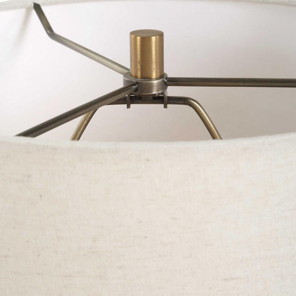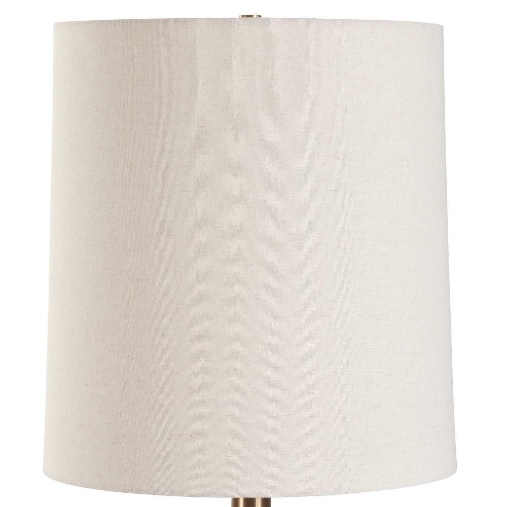 The Bower Table Lamp Features A Textured Ceramic Base Finished In A Modern Matte Black Glaze Paired With Antique Brass Plated Details. The Tall, Slightly Tapered, Round Hardback Shade Covered In A Casual White Fabric With Natural Slubbing Completes This Piece.