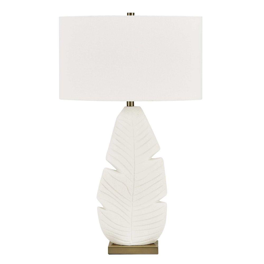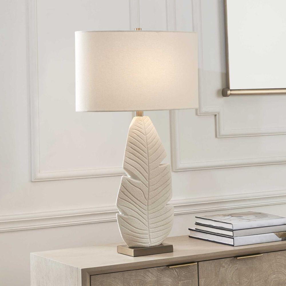The Palm Leaf Table Lamp Features An Intricately Textured Ceramic Leaf Motif Finished In A Warm Matte White Glaze, Accented With Brass Plated Details. The Oval Hardback Shade Is Covered In A Crisp White Linen Fabric.