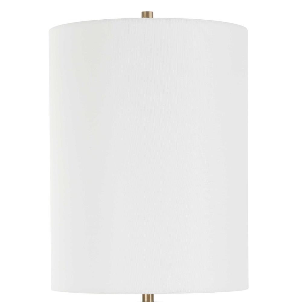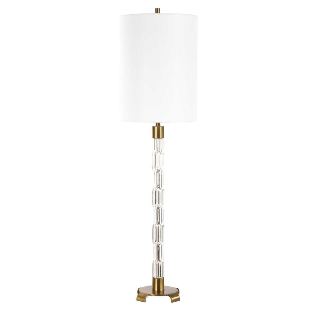 Step Back In Time With This Mid-century Table Lamp. The Meticulous Craftsmanship Is Evident In Its Petite Crystal Column, Intricately Detailed With An Embossed Pattern And Complemented By Antique Brass Plated Accents. The Tall Round Hardback Shade Is Covered In A Crisp White Linen.