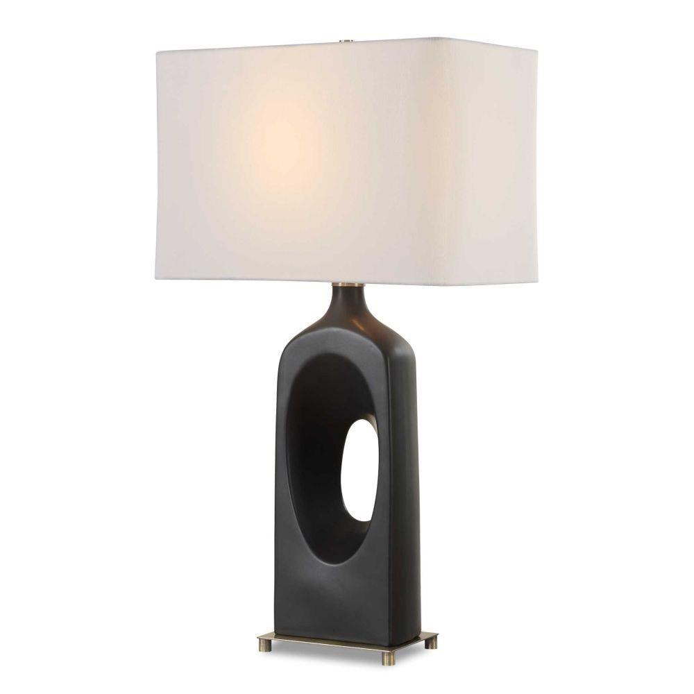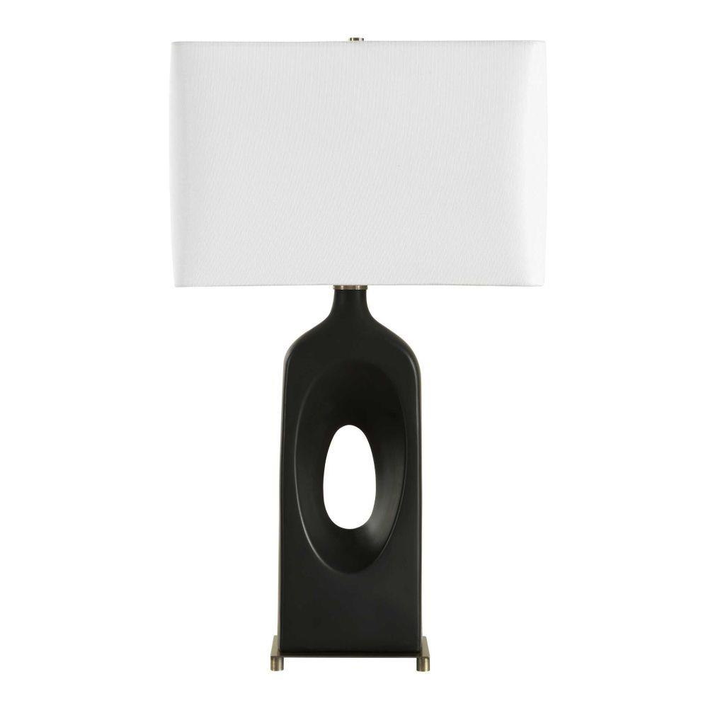 The Void Table Lamp Showcases A Bold, Geometric Ceramic Base Finished In A Matte Black Glaze, Accented By Brass Plated Detailing. The Rectangular Hardback Shade Is Covered In A Crisp White Linen Fabric.
