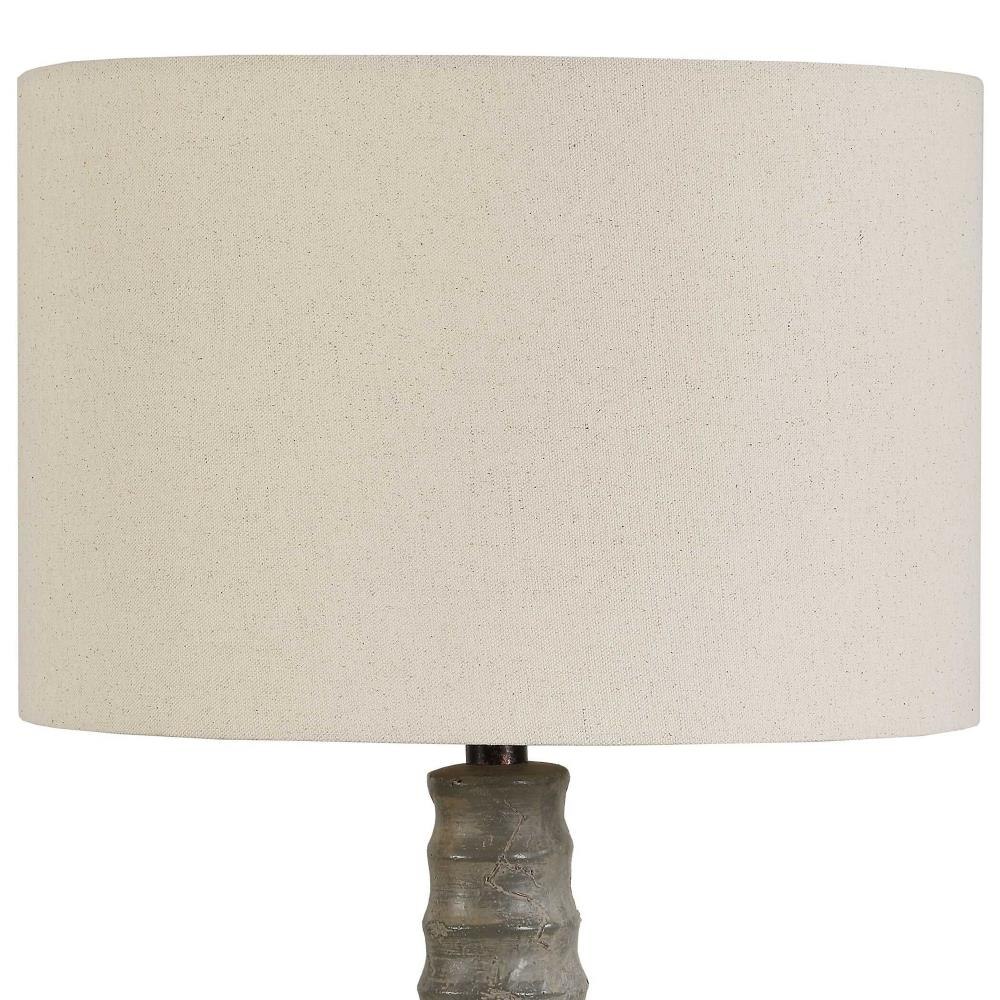 Inspired By Old Hand Turned Pottery, This Indoor/outdoor Table Lamp Exudes Rustic Charm With Its Ribbed Concrete Base In Heavily Distressed Gray And Dark Bronze Accents. The Round Hardback Shade Is Covered In A Light Beige, Weather Resistant Linen Fabric.
