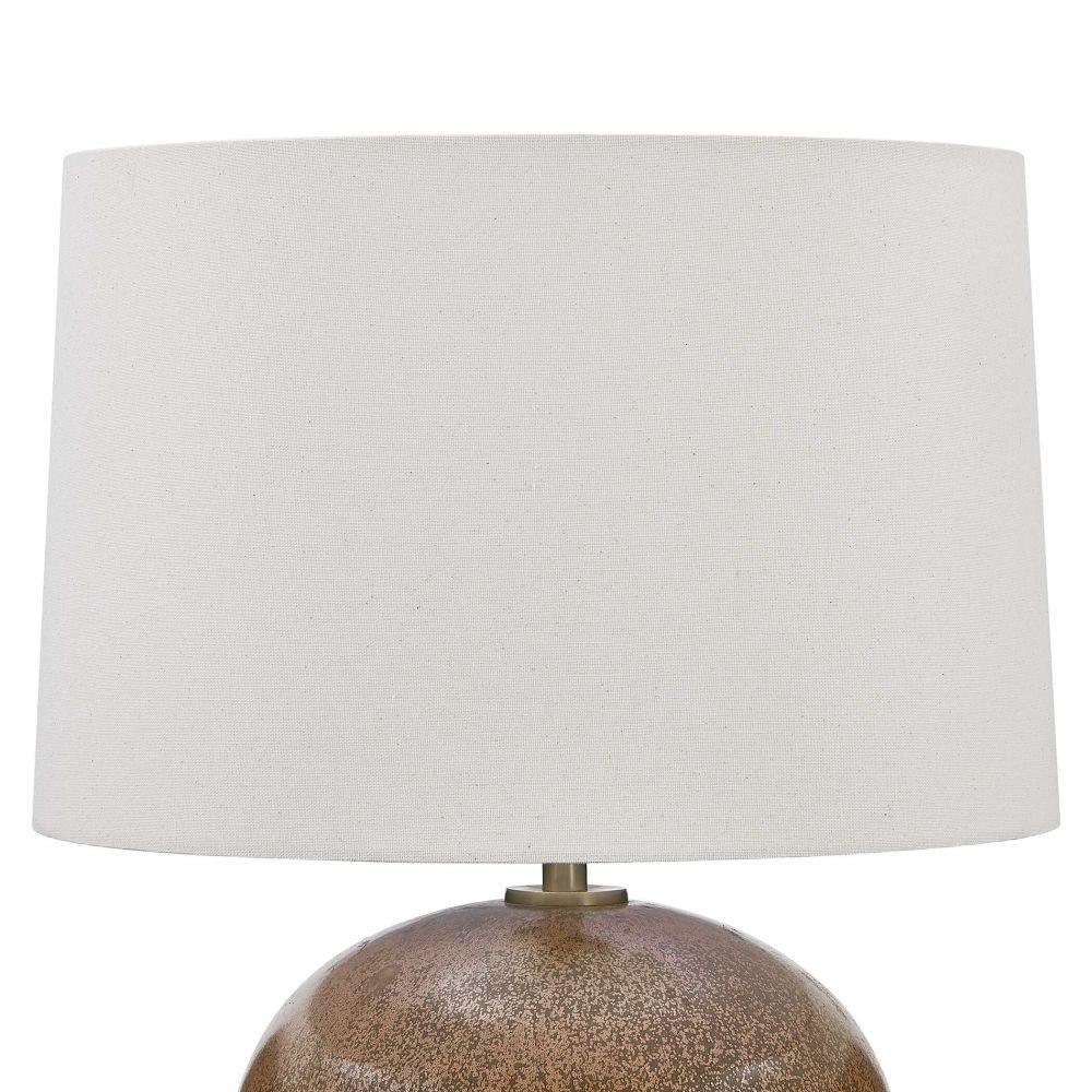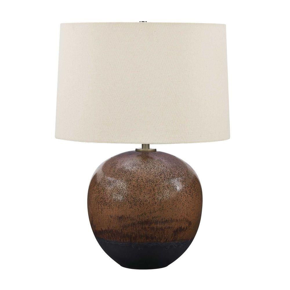 This Ceramic Table Lamp Boasts A Striking Metallic Rust Brown Glaze Paired With A Bottom Portion In Dark Bronze, Accented By Antique Brass Plated Details. The Slightly Tapered Hardback Shade Is Covered In A Light Beige Fabric With Natural Slubbing. Due To The Nature Of Fired Glazes On Ceramic Lamps, Finishes Will Vary Slightly.
