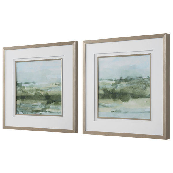 Discover the calming allure of framed prints. This abstract landscape showcases shades of lush green from olive to sage. The prints are perfectly complemented by a brushed champagne gold frame with matching fillet, double white mat, and placed under protective glass. Ideal for bringing a peaceful and sophisticated touch to your decor. Artwork by Emma Caroline.