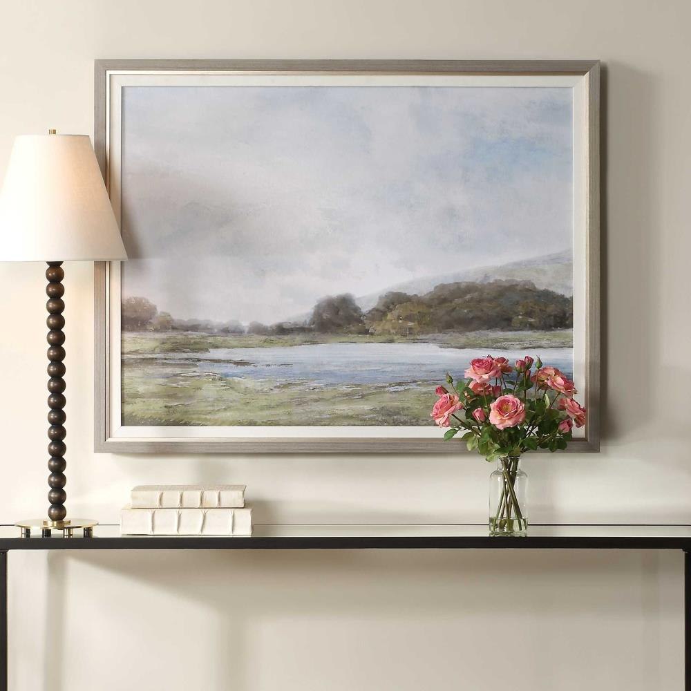 Find Tranquility In This Serene Framed Print. A Simple Yet Captivating Waterscape Features A Muted Palette Of Green And Blue Hues. This Minimalist Artwork Is Perfect For Creating A Peaceful Atmosphere In Any Space. A Gray Washed Wooden Frame With A Gold Liner And White Linen Mat Completes The Artwork.