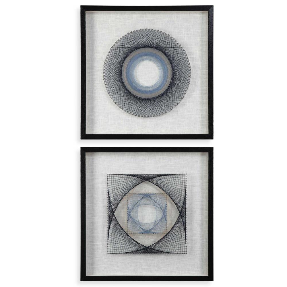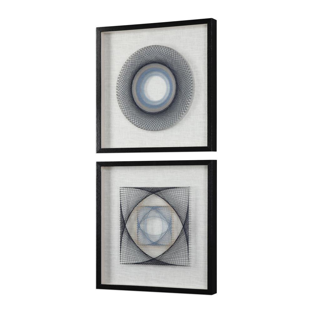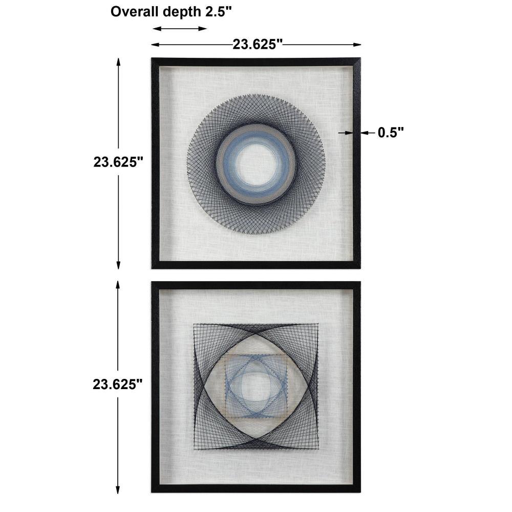 These Fun Shadow Boxes Feature 3-dimensional Layered String Art, Hand Threaded Around Individually Hammered Pin Nails In Easy Shades Of Blue, Over A Neutral Linen Backing With A Black Pine Frame.