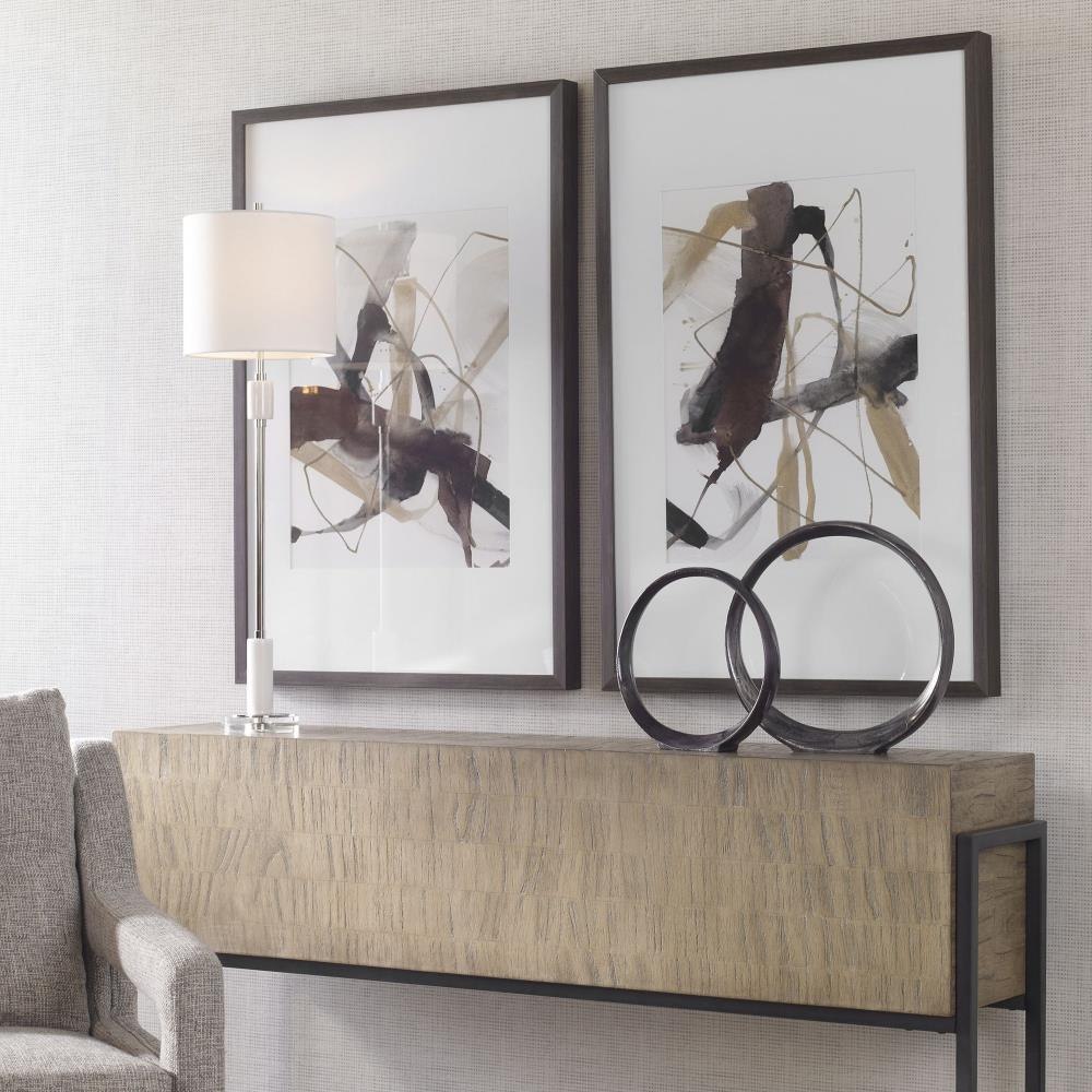 This Abstract Artwork Displays A Harmonious Blend Of Neutral Brushstrokes In Gray, Black, And Warm Chestnut Tones. Each Print Is Accented By A White Mat Under Glass With A Dark Walnut Finished Frame. Artwork By Jennifer Goldberger.