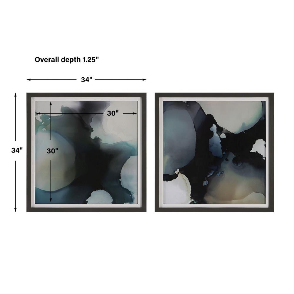 The Telescopic Modern Watercolors Display Stunning Visuals In Rich Blue, White, And Amber Tones. Each Print Is Under Glass And Framed In A Solid Wood Frame With A Dark Gunmetal Finish And A White Linen Liner. Artwork By Kippi Leonard.