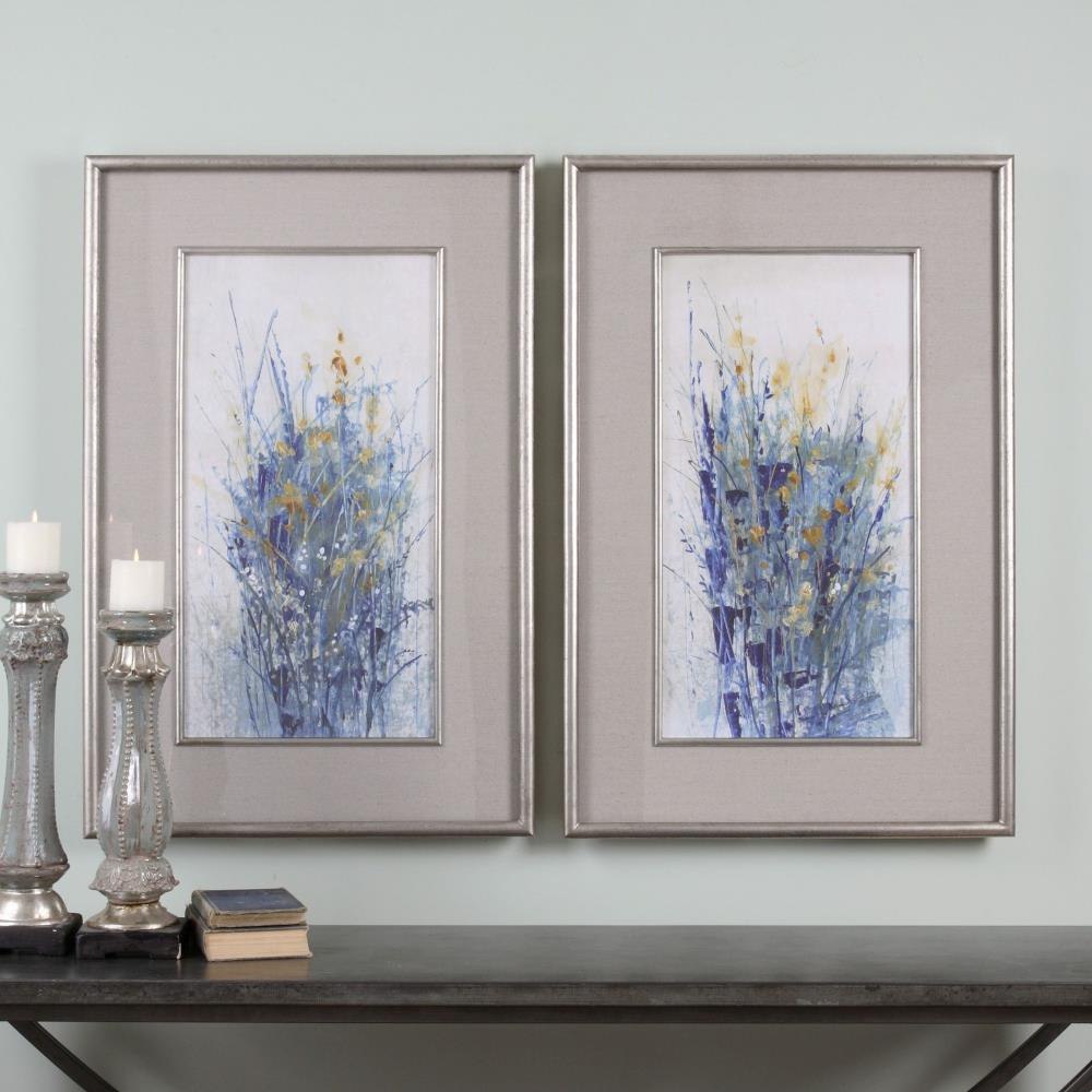 These Vibrant Prints Showcase A Modern Interpretation Of Traditional, Floral Artwork. Saturated Indigo Hues Give These Pieces A Rich Fluidity And Dark Contrast From The Golden Accents And White Background. Pale Gray Linen Mats Surround Each Print. Distressed Silver Frames With Dark Gray Accents And Matching Fillets Complete These Prints. Each Print Is Placed Under Protective Glass.