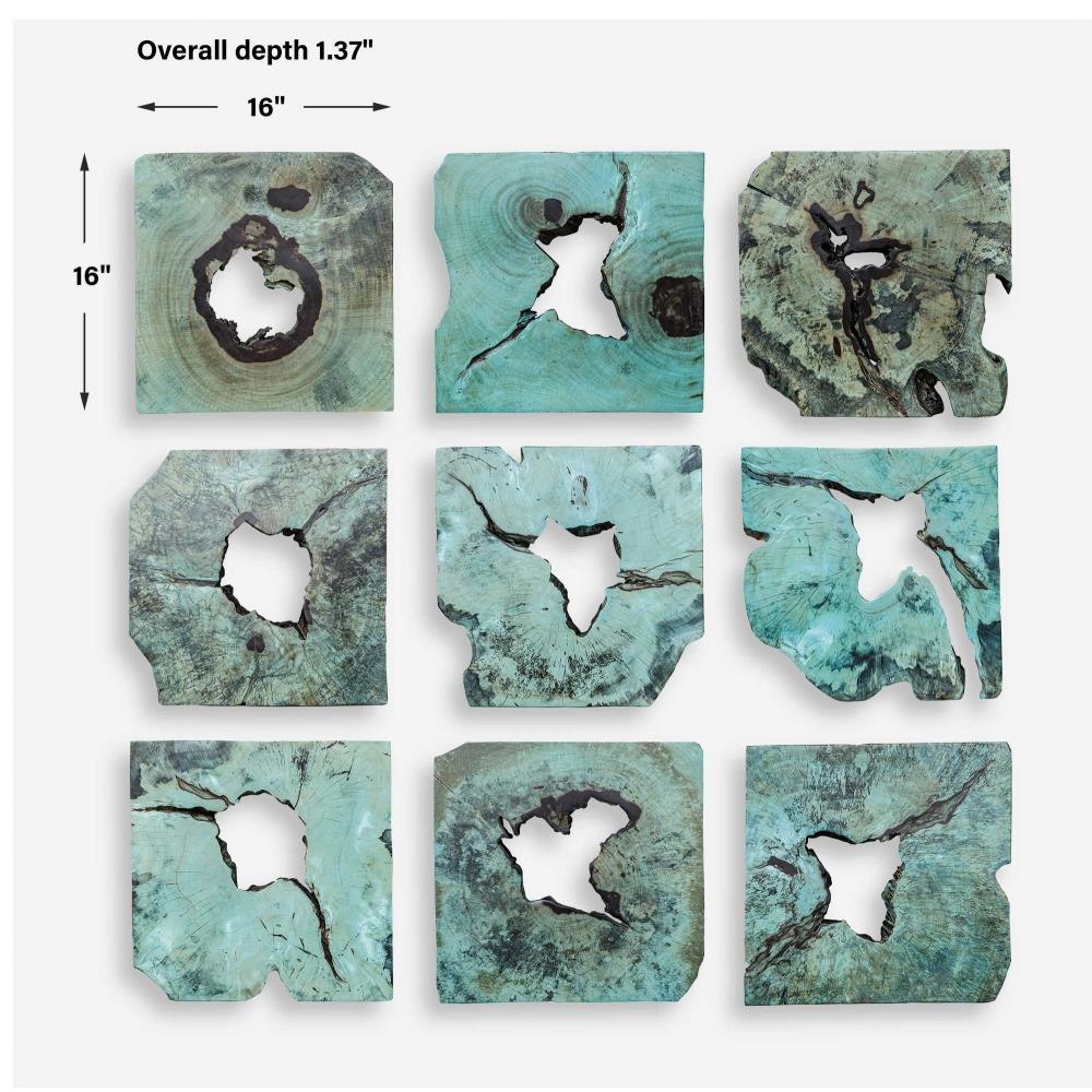 This Set Of Nine Wood Wall Pieces Is Crafted From 100% Natural Tamarind Wood In A Blue Green Finish. Because Each Is Individually Handcrafted, Natural Variation Will Occur From Piece To Piece.