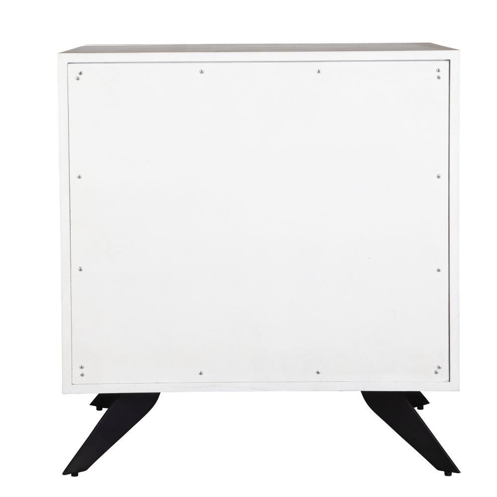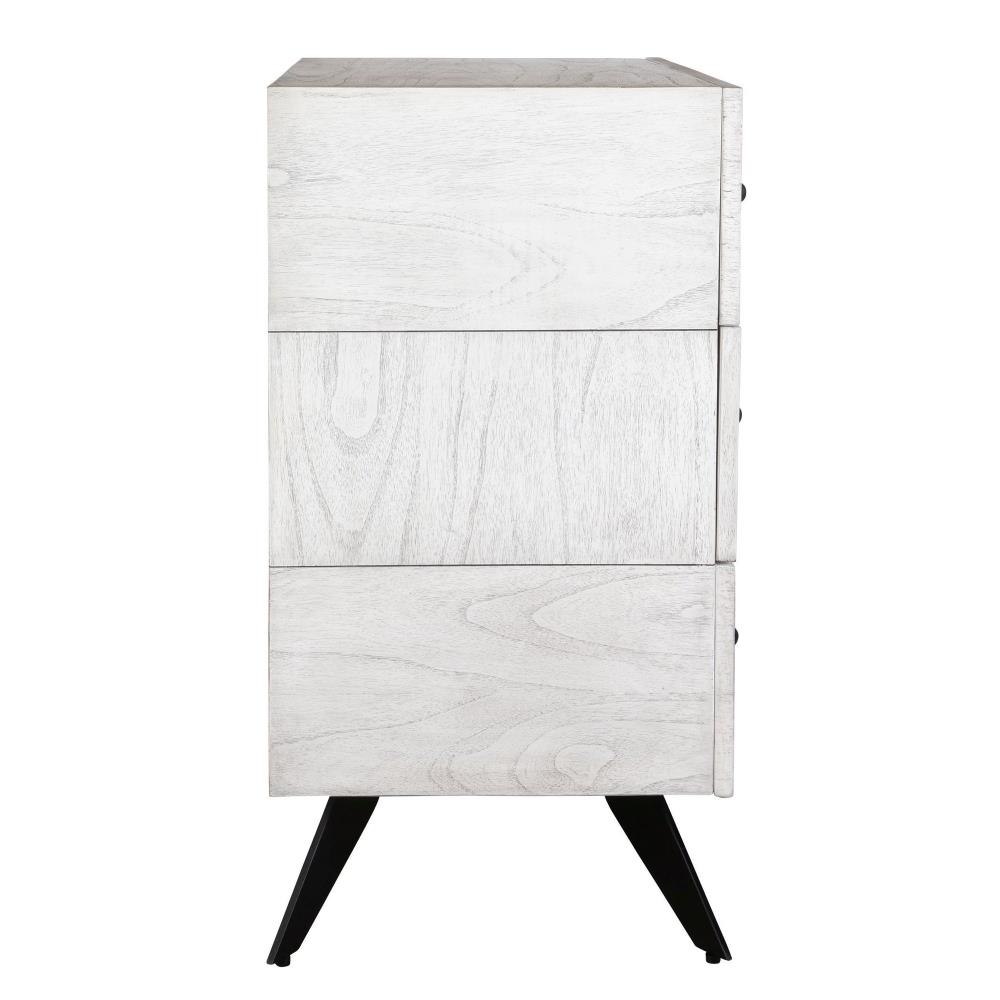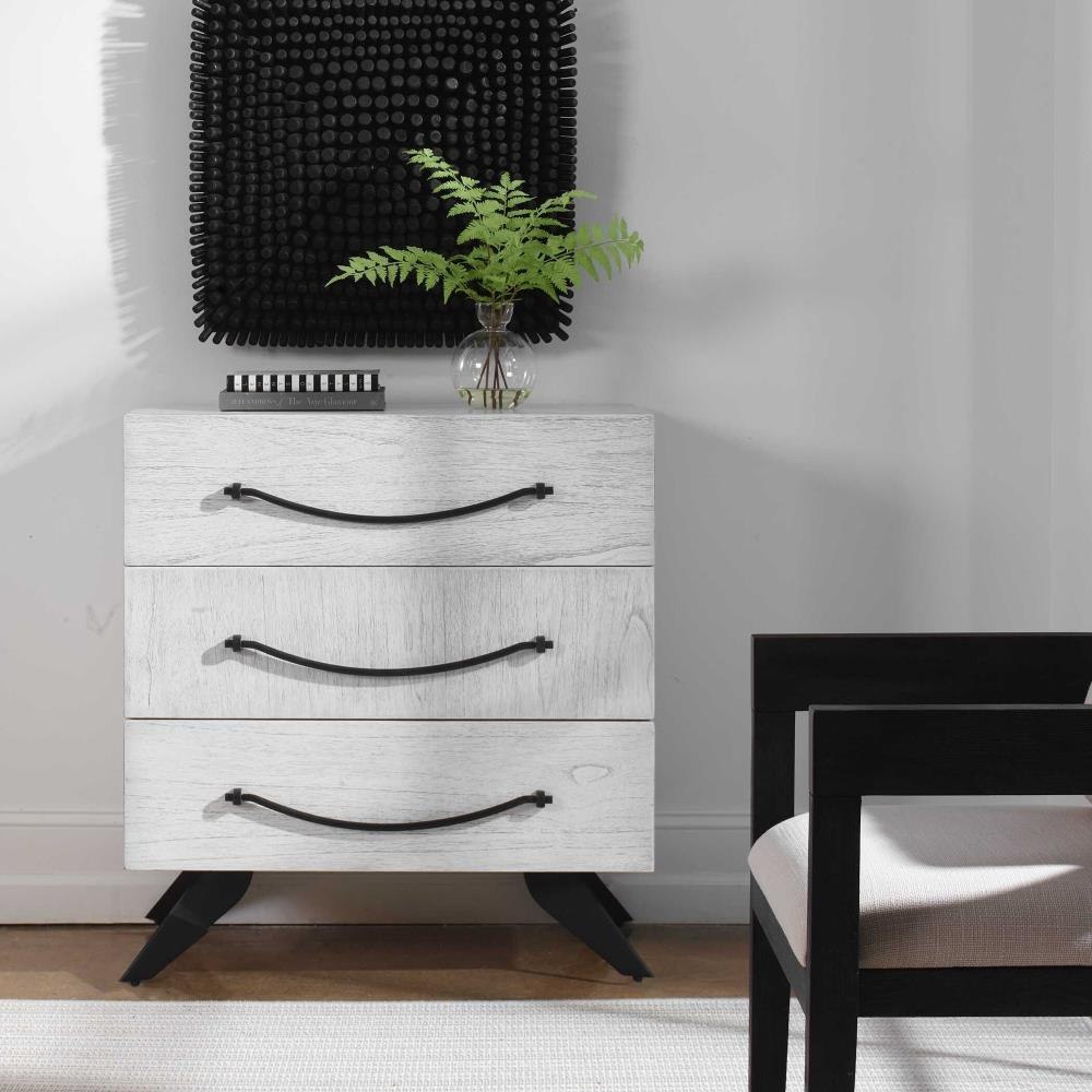 The Vivi Three Drawer Chest Features A White Finish With Black Iron Accents. Displaying Alternating Mindi Veneer Directions Giving It A Playful Element, While The Wide Black Hardware And Matching Legs Add To Its Contemporary Look. Has Soft Closing Drawer Glides.