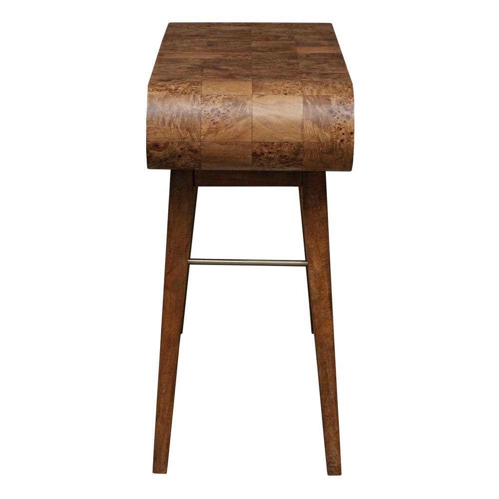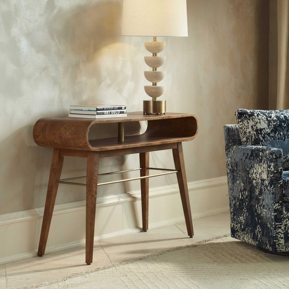 Crafted From Rich Burl Veneer And Java Wood, This Distinctive Console Table Effortlessly Brings A Mid-century Modern Charm To Your Space. Its Hollow Interior Offers Practical Storage While Maintaining Clean Lines And Organic Curves. Accented With Brass Finished Hardware.